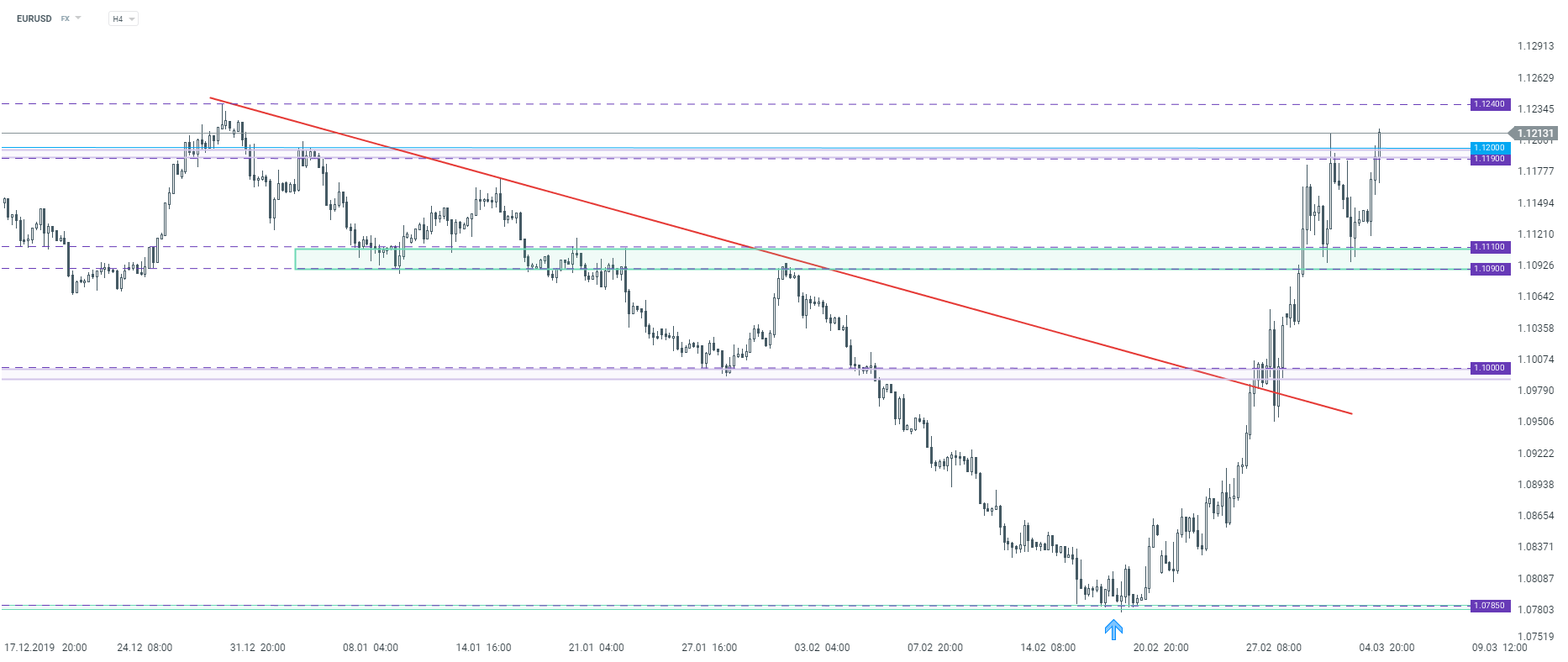 Kurs EURUSD po reakcji w strefie wsparcia przy 1,1100 zdołał wykonać falę na kolejne 100 pipsów w górę, wybijając okrąłgy poziom 1,12USD. Aktualnie mozliwy jest dalszy ruch w kierunku maksimów z końcówki grudnia 2019 r. przy 1,1240 . Źródło: xStation5