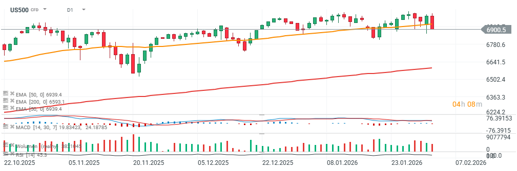- Amerykański sektor technologiczny notuje dziś potężne spadki, spychająć notowania Nasdaq 100 o ponad 2%. Kontrakt na S&P 500 (US500) odnotował blisko 1,7% cofnięcie i spada do 6900 punktów. Wśród spółek BigTech najmocniej tracą Nvidia i Microsoft (ponad 3%), ale fatalnie radzi sobie sektor usług IT. Wzrosty obserwujemy na akcjach banków, spółek obronnych i producentów ropy i gazu.