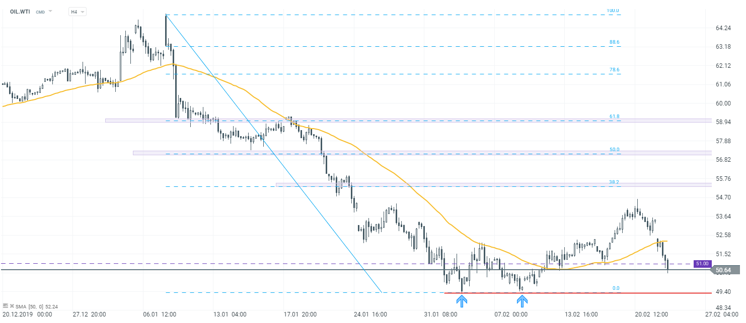 Ropa WTI wraca poniżej poziomu 51$ za baryłkę. Tym samym notowania ponownie znajdują się w kluczowej strefie wsparcia z interwału D1. Niemniej dopóki cena pozostaje poniżej średniej SMA50 - sprzedający mają przewagę i wykluczony jest dalszy ruch w kierunku południowym. Źródło: xStation5