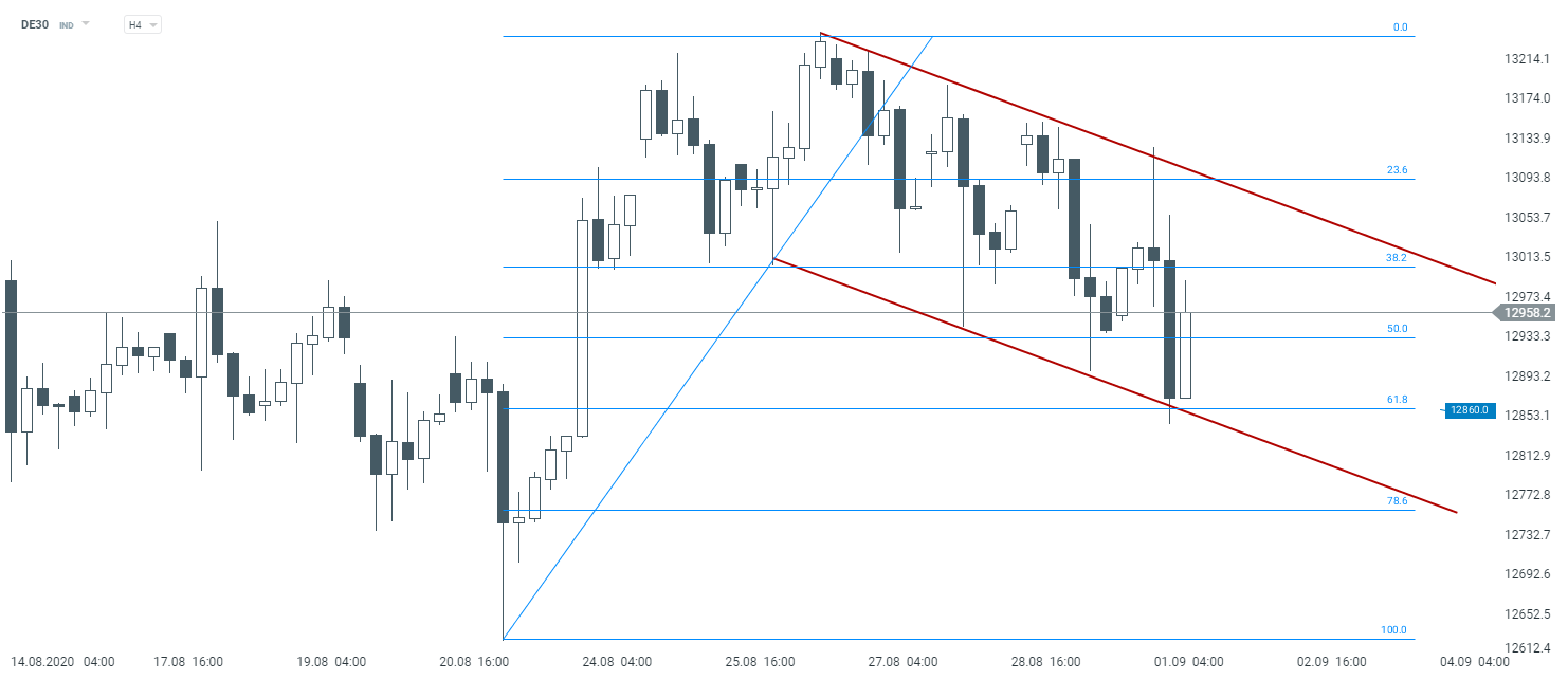 Notowania niemieckiego indeksu DAX zdołały wymazać sporą część dzisiejszych spadków. Kurs odbił się od dolnego ograniczenia kanału spadkowego, w rejonach mierzenia 61,8% Fibonacciego, poziom 1860 pkt powinien stanowić istotne wsparcie podczas jutrzejszej sesji. Źródło: xStation5