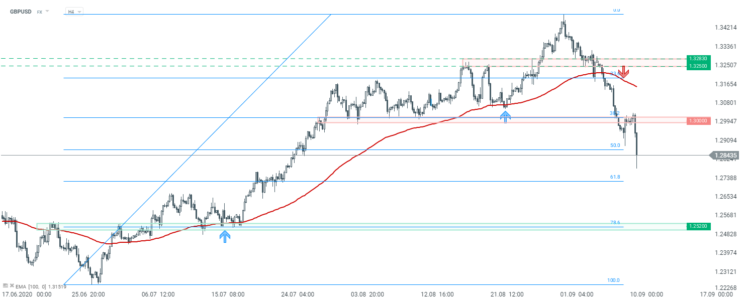 GBPUSD pogłębia spadki. Pomimo próby wykonania korekty, notowania nie zdołały utrzymać się powyżej strefy przy 1,30 USD i zanurkowały. Aktualnie najbliższe wsparcie może stanowić mierzenie 61,8% Fibonacciego, jednak strefa przy kolejnym zniesieniu, czyli 78,6% wydaje się silniejsza, ponieważ w tych rejonach historycznie pojawiały się reakcje cenowe. Źródło: xStation5