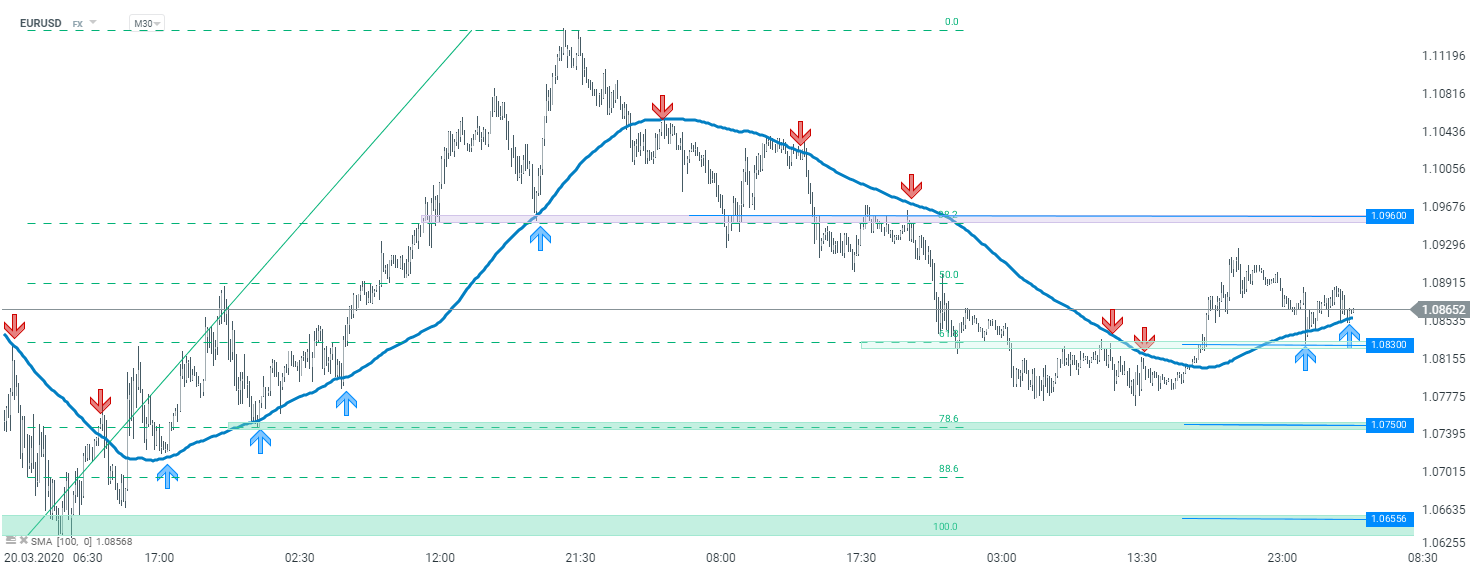 W ostatnich dniach kurs EURUSD respektuje średnią SM100 na interwale M30. Dziś ponownie możemy obserwować jej obronę, co może świadczyć o potencjale wzrostowym w kierunku 1,0960. W przeciwnym razie, przokonanie wsparcia przy 1,0830, może doprowadzić do ataku na poziom 1,0750. Źródło: xStation5