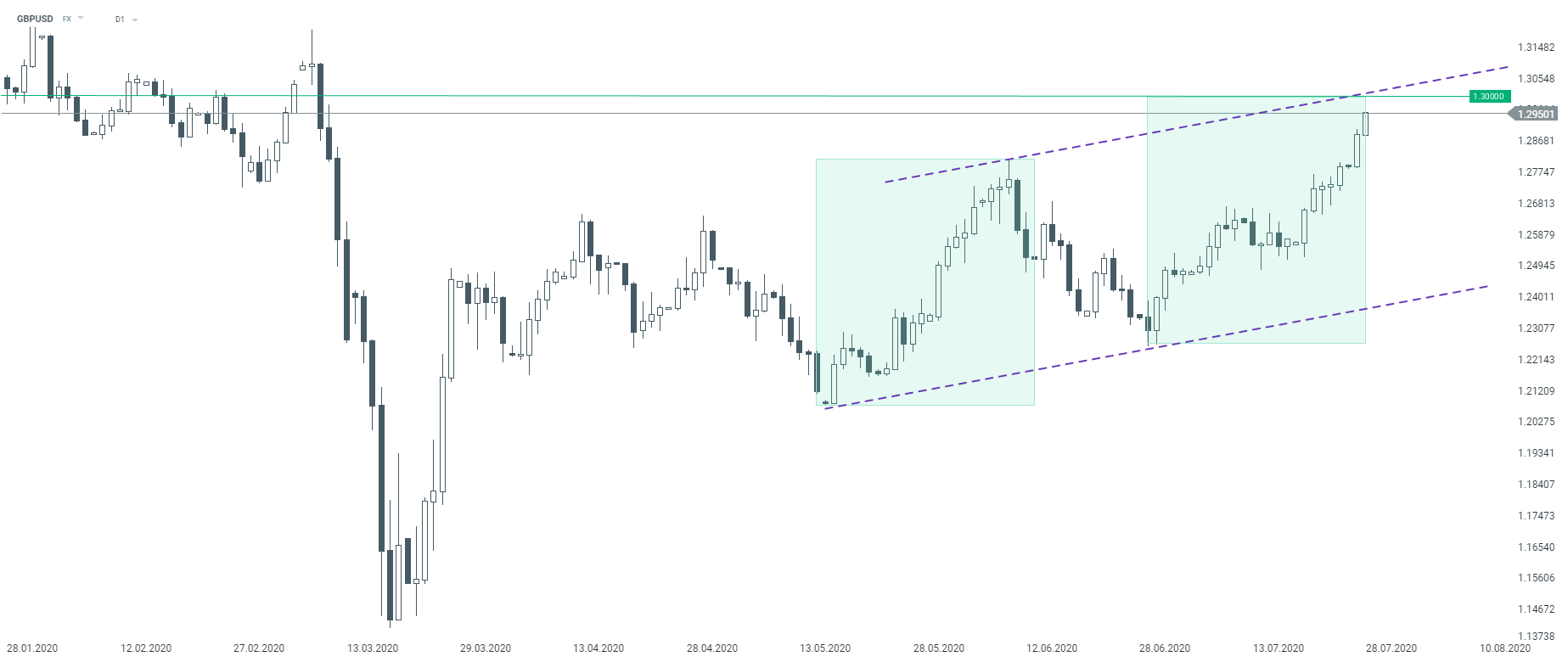 GBPUSD kontynuuje wzrosty. Najbliższy opór może stanowić poziom 1,30 USD, gdzie znajduje się równość z poprzednią falą wzrostową, a także górne ograniczenie lokalnego kanału wzrostowego. Źródło: xSstation5