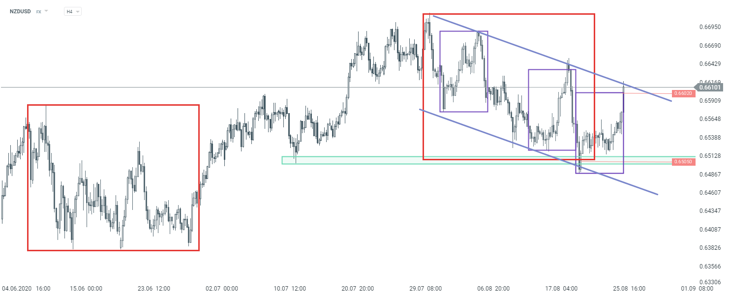 Po obronie wsparcia przy 0,6505 notowania atakują górne ograniczenie lokalnego (spadkowego) układu 1:1. Jeżeli zostanie on pokonany, droga w kierunku ostatnich szczytów przy 0,6700 zostanie otwarta. W przeciwnym razie, pojawienie się tutaj sprzedających, może doprowadzić do kolejnego ataku na wsparcie przy 0,6505. NZDUSD interwał H4. Źródło: xStation5