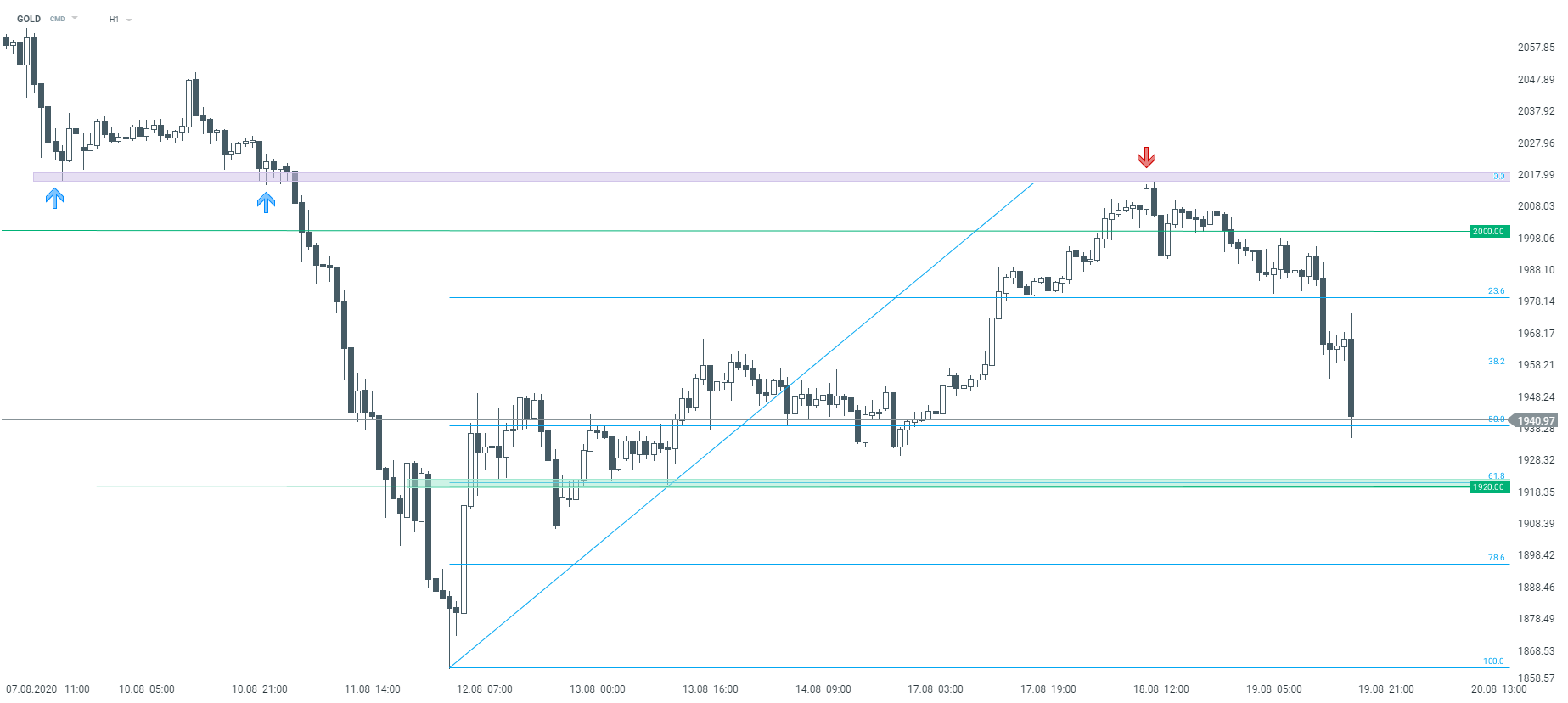 Cena złota dynamicznie traci podczas dzisiejszej sesji. Kluczowym wsparciem pozostają okolice poziomu 1920$, gdzie znajdują się szczyty z 2011 roku oraz mierzenie 61,8% ostatniej lokalnej fali wzrostowej. Kluczowym oporem pozostaje strefa przy 2016$. Złoto interwał H4. Źródło: xStation5