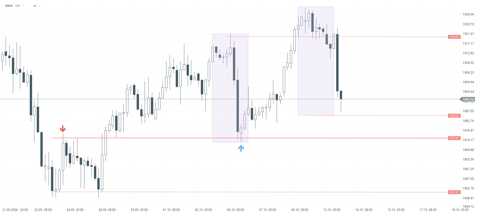Złoto mocno traci podczas dzisiejszej sesji. Patrząc na interwał H4, kurs zbliżył się do wsparcia wynikającego z układu 1 :1 (1885 dolarów), tym samym obecnie obserwowany ruch jest niemal identyczny, jak ten z 6 października. Jeżeli poziom ten zostanie wybity, droga w kierunku 1875$ zostanie otwarta, miejsce to wynika z sekwencji czyli wcześniejszych dołków i szczytów. Źródło: xStation5