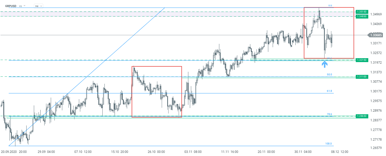 Pomimo wczorajszej silnej przeceny, notowania GBPUSD odbiły się na wysokości kluczowego wsparcia przy 1,3215. Miejsce to wynika z dolnego ograniczenia układu 1:1 oraz mierzenia 38,2% Fibo. Dopóki nie dojdzie do zanegowania wsparcia, możliwy jest atak na strefę oporu przy 1,3485-1,3515, która wynika ze szczytów z sierpnia tego roku i grudnia 2019.