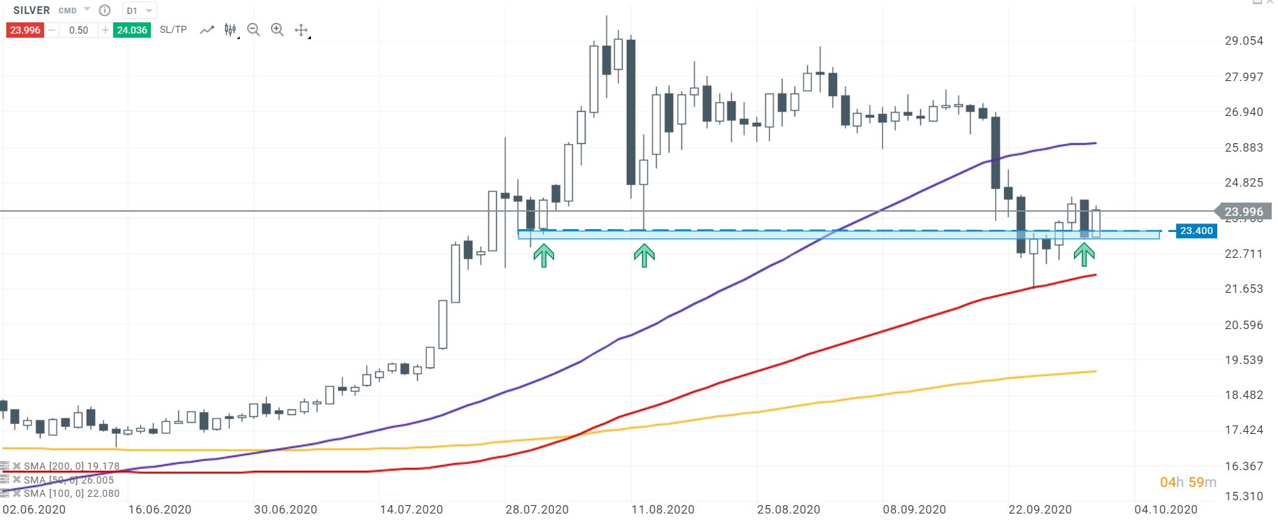Srebro utrzymuje się powyżej ważnej bariery $23,4. Obecnie ceny srebrnego kruszcu rosną o ponad 3%. Źródło: xStation5