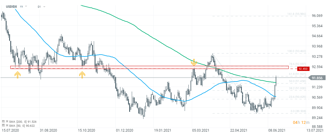 USDIDX, wystrzelił w górę, co odzwierciedla siłę dolara amerykańskiego po wczorajszym posiedzeniu Fed. Kurs przebił zniesienie 50% fali spadkowej zapoczątkowanej pod koniec marca 2021. Co więcej, dziś przetestowano również zniesienie 61,8%. Patrząc na poprzednie reakcje cenowe, ważnym poziomem wydają się okolice 92,45, nieco wyżej można z kolei odnaleźć zniesienie Fibonacciego 78,6%. Źródło: xStation5