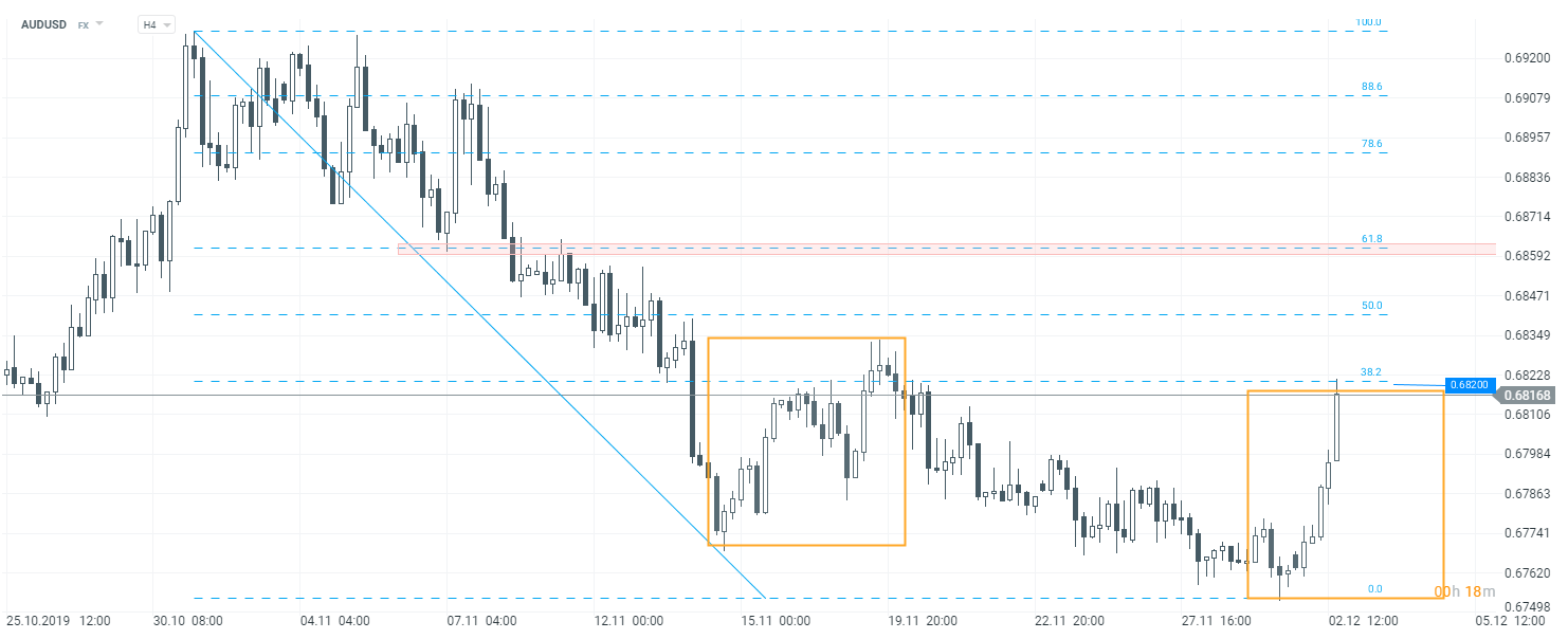 Podczas sesji azjatyckiej warto zwrócić uwagę na dolara australijskiego. O godzinie 4:30 poznamy decyzję RBA w sprawie stóp procentowych, co powinno przełożyć się na podwyższoną zmienność na parach z AUD. Co prawda prawda rynek nie spodziewa się zmian ze strony banku centralnego, niemniej inwestorzy na pewno będą szukać w oświadczeniu informacji co do dalszej polityki monetarnej. Technicznie sytuacja na AUDUSD wygląda ciekawie. Za sprawą słabszego dolara, kurs dotarł do oporu wynikającego z układu 1:1 i mierzenia 38,2% FIbonacciego. Aktualnie okolice poziomu 0,6820 są więc kluczowe. Jeśli pojawi się tutaj podaż, będzie to sygnał do dalszej przeceny i ataku na listopadowe dołki. Z drugiej jednak strony, pokonanie oporu może doprowadzić do ataku na poziom 0,6860.
