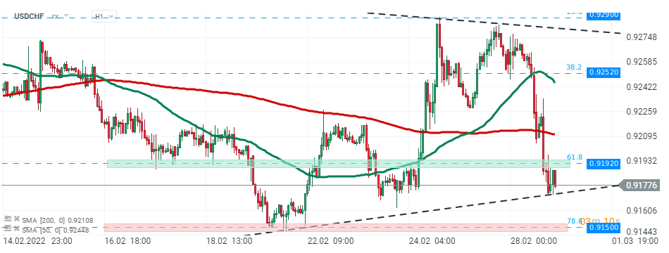 Para USDCHF gwałtownie traciła podczas dzisiejszej sesji i obecnie testuje dolne ograniczenie formacji trójkąta. Jeśli dojdzie do przełamania dolnego ograniczenia, ruch spadkowy może przyspieszyć w kierunku kolejnego wsparcia na poziomie 0,9150, które zbiega się z poziomem 78,6% zniesienia Fibonacciego ostatniej fali wzrostowej. Z drugiej strony, jeśli kupującym uda się odzyskać kontrolę, wówczas opór na poziomie 0,9192 może być zagrożony. Źródło: xStation 5
