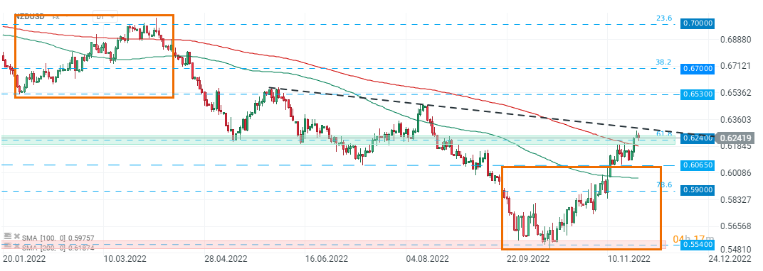 Parze NZDUSD nie udało się wybić ponad długoterminową linię trendu spadkowego i powrócić do głównego wsparcia na 0,6240. Źródło: xStation5