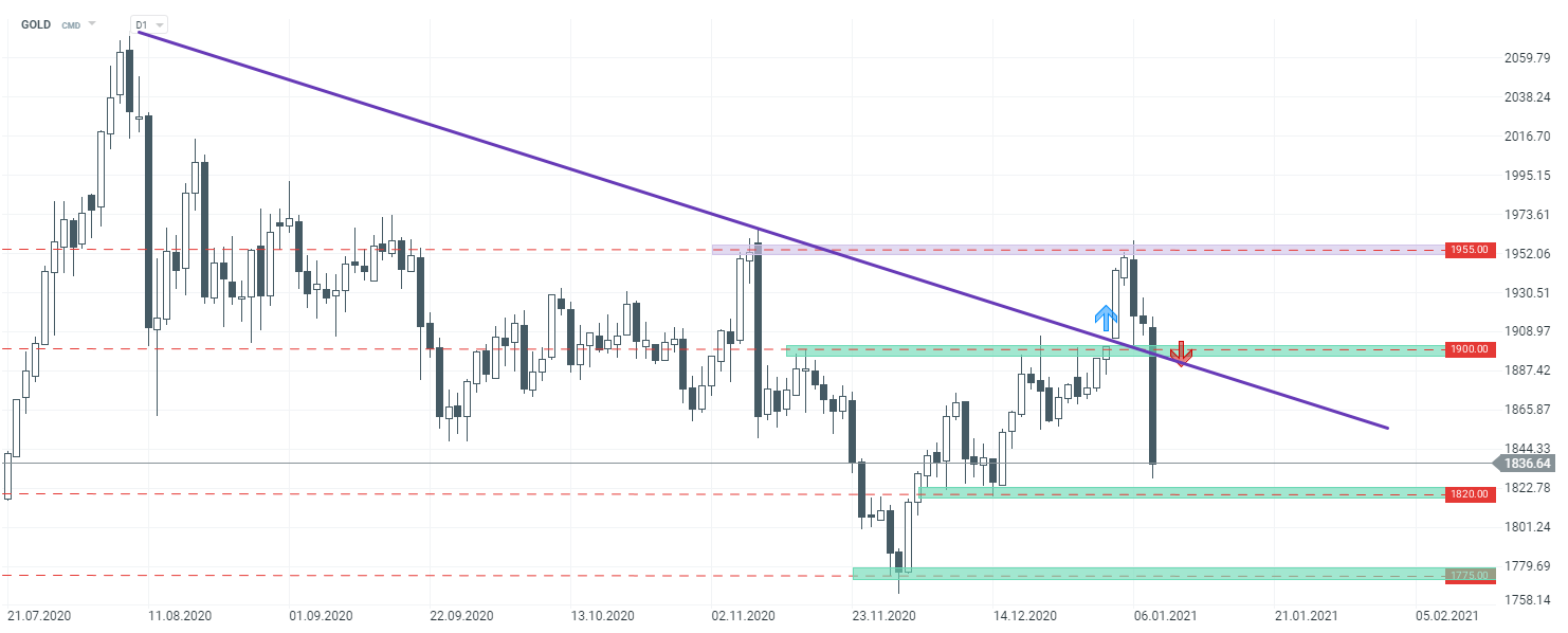 Pomimo, że początek tygodnia przyniósł solidne wzrosty na rynku złota, sytuacja zmieniła się diametralnie pod jego koniec. Notowania wróciły poniżej poziomu 1900$, po czym przecena przybrała na sile. Najbliższe ważne wsparcie znajduje się przy poziomie 1820$. Jeżeli dojdzie do jego wybicia, spadki mogą się rozszerzyć w kierunku 1775$. Źródło: xStation5