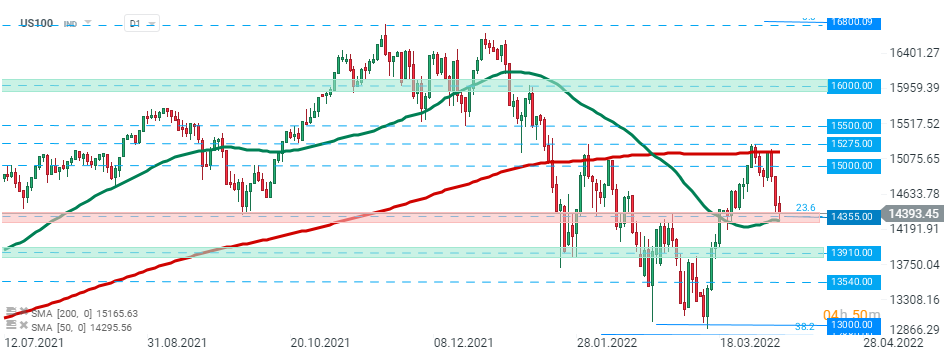 US100 przedłuża straty trzecią sesję z rzędu. Indeks obecnie testuje główne wsparcie w okolicach 14355 pkt, które wyznacza 23,6% zniesienie Fibonacciego fali wzrostowej zapoczątkowanej w marcu 2020 r. oraz wcześniejsze reakcje cenowe. Źródło: xStation5