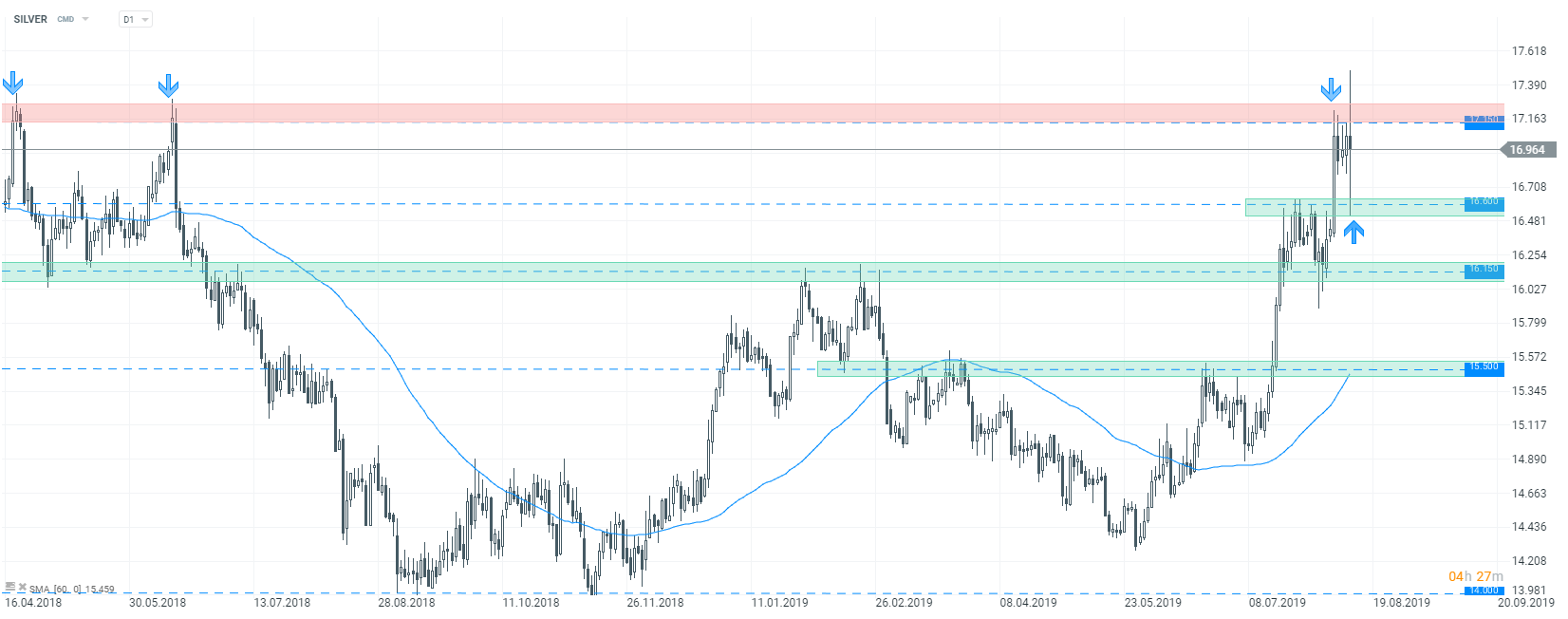Na rynku srebra mogliśmy dziś obserwować największa zmienność w tym roku. Wtorkowa sesja rozpoczęła się od wzrostów, niemniej doniesienia o ociepleniu stosunków na linii USA- Chiny doprowadziły do nagłego zwrotu akcji. Na rynku CFD cena tego surowca zahaczyła o poziom 17,5$. Druga część sesji przyniosła wyraźne spadki, co doprowadziło do powrotu poniżej strefy oporowej i testu wsparcia przy 16,6$. Pomimo bardzo dużej zmienności, wsparcie wynikające z ostatnich wierzchołków zostało wybronione. Jeśli w kolejnych dniach cena będzie się utrzymywała powyżej, niewykluczony jest powrót do wzrostów. Niemniej dzisiejsze doniesienia mogą wywierać presję spadkową, tym bardziej że srebro ma za sobą silny rajd wzrostowy i korekta byłaby czymś zupełnie normalnym. Wznowienie negocjacji może być czynnikiem, który doprowadzi do większej przeceny. Jednak aby mówić o dalszej przecenie, kurs musiałby wybić dołem strefę przy 16,6$.