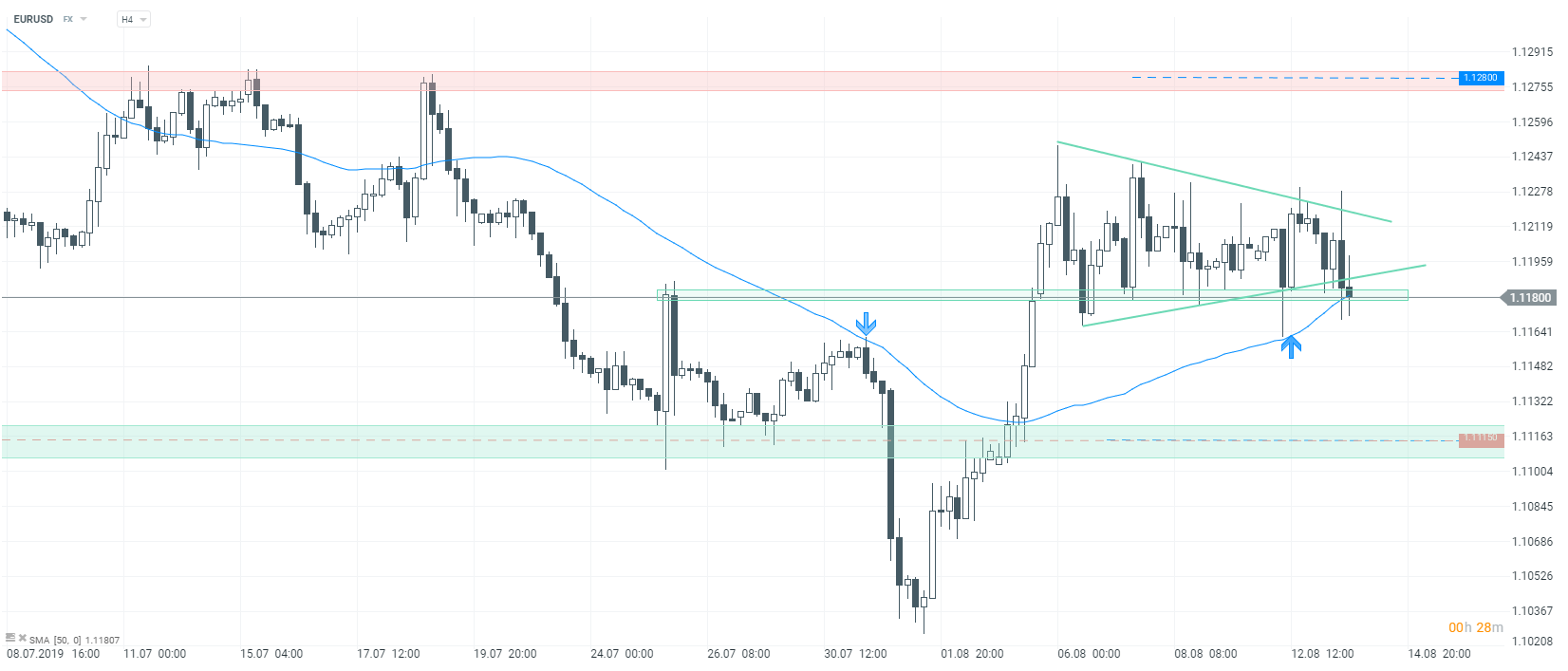 Jeśli chodzi o rynek walutowy, kurs EURUSD znajduje się w godzinach wieczornych na 0,3% minusie. Za jedno euro trzeba płacić 1,1180 dolara amerykańskiego. Podczas dzisiejszej sesji poznaliśmy odczyt indeksu ZEW, który znalazł się na najniższym poziomie od 2011 roku. Rynek co prawda spodziewał się dalszej słabości niemieckiej gospodarki, jednak odczyt był dużo gorszy od oczekiwań. Analitycy przewidywali spadek z poziomu - 24,5 pkt do -30 pkt, z kolei ostatecznie wynik za sierpień wyniósł aż - 44,1 pkt. Reakcja na kursie EURUSD była jednak chwilowa i wynosiła niespełna 10 pipsów, po czym rynek ruszył w górę. Tendencja wzrostowa utrzymywała się do godziny 14:30, kiedy poznaliśmy odczyty odnośnie inflacji z USA, która była nieznacznie lepsza od oczekiwań, od tego czasu kurs zaczął zniżkować. Spadki przyspieszyły w momencie wypłynięcia informacji o polepszeniu stosunków gospodarczych między Chinami i USA. Pomimo zwiększonej dynamiki ruchów, kurs utrzymuje się w konsolidacji i nieudolnie próbuje wybić się z formacji trójkąta. Aktualnie wsparcie stanowi 50-okresowa średnia krocząca ( na którą rynek coraz mocniej napiera), jej pokonanie powinno otworzyć drogę w kierunku poziomu 1,1115. Jednak w przypadku dalszej obrony, należy się spodziewać ruchu w kierunku strefy oporowej przy 1,1280.