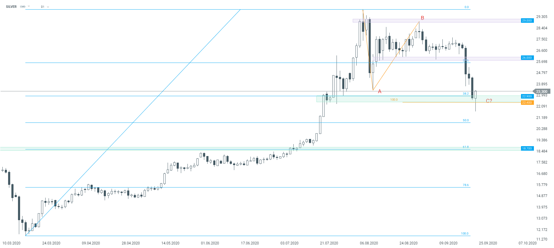 Srebro rozpoczęło dzień od spadków, jednak pod koniec sesji widać wyraźne odbicie, przez co na interwale D1 istnieje szansa na pojawienie się pro-wzrostowej formacji pin bara. Strefa 22,4 - 22,9$ wynika z geometrii na potencjalnej korekcie prostej ABC.Źródło: xStation5