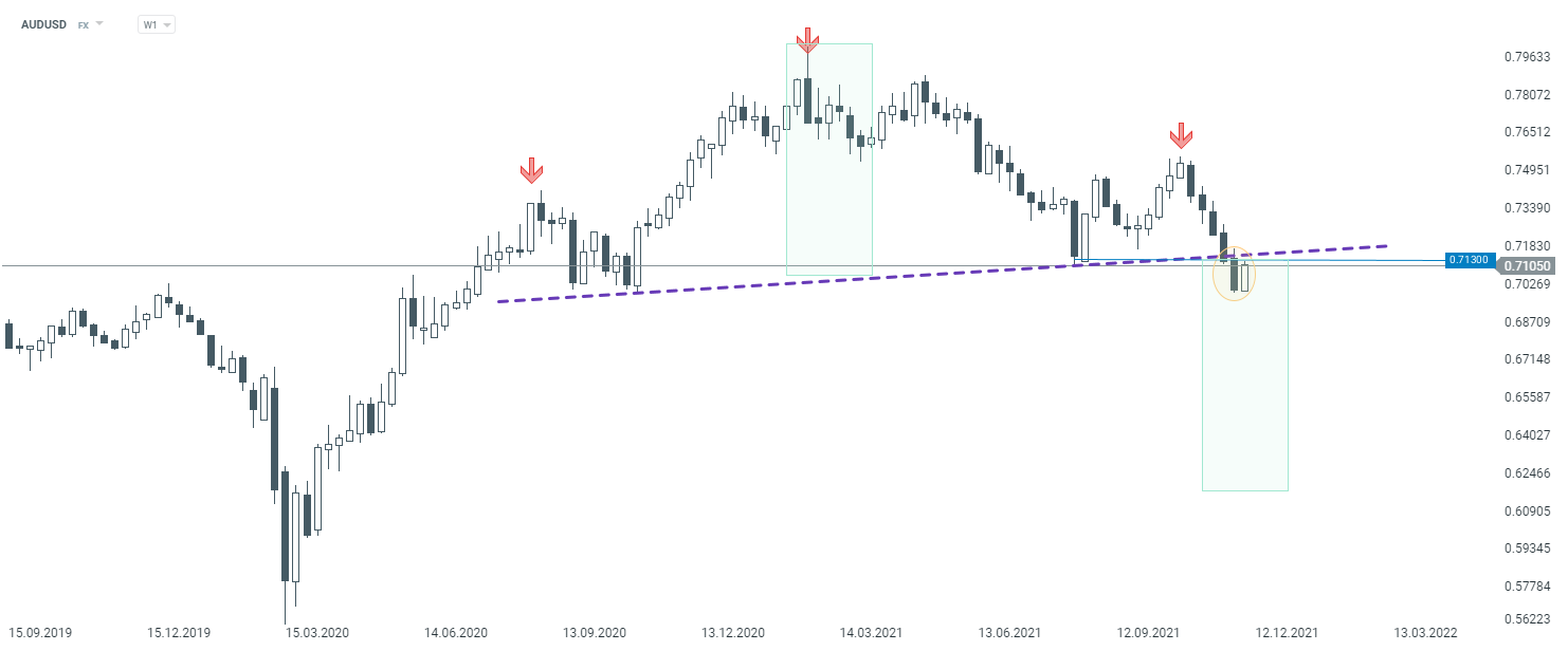 Pomimo odreagowania, AUDUSD utrzymuje się poniżej linii szyi szerokiej formacji RGR, interwał W1. Źródło: xStation5