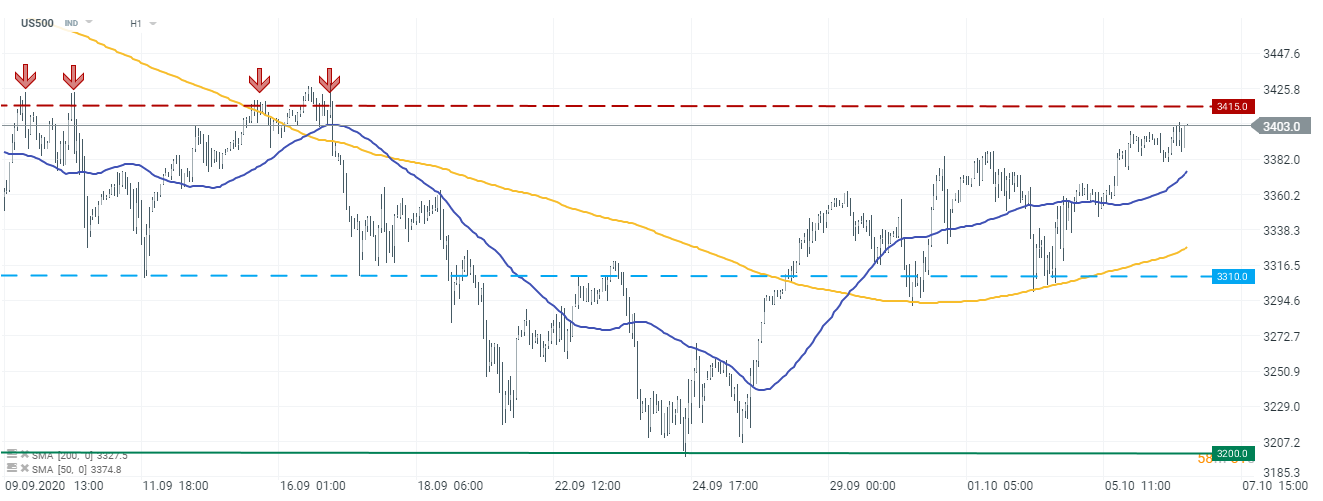 US500 systematycznie pnie się w górę, zbliżając się do 3 415 pkt. Barierę można potraktować jako ważny krótkoterminowy opór, gdyż byki kilkukrotnie nie były w stanie przebić tego poziomu w pierwszej połowie września. Źródło: xStation5
