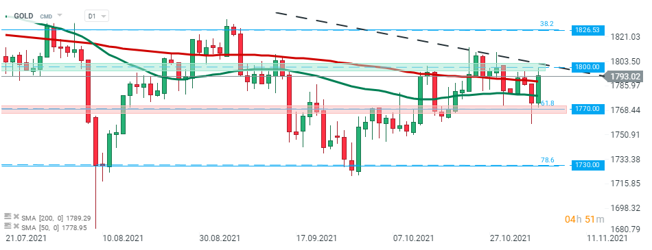 Złoto gwałtownie wzrosło i zdołało odrobić wczorajsze straty. Na początku sesji cena odbiła się od wsparcia na poziomie 1770 USD, które jest oznaczone 61,8% zniesieniem Fibonacciego oraz poprzednimi reakcjami cenowymi. Obecnie złoto zbliża się do psychologicznego oporu na poziomie 1800 USD, który jest wzmacniany przez linię trendu spadkowego. W przypadku wybicia w górę, aprecjacja może przyspieszyć w kierunku kolejnego oporu na poziomie 1826,53 USD. Źródło: xStation 5