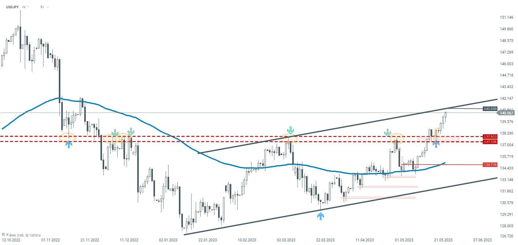 Kurs USDJPY kontynuuje ruch wzrostowy po przebiciu kluczowej strefy oporu 137,30 - 137,90. W przypadku utrzymania sentymentu, możliwy jest atak na górne ograniczenie kanału wzrostowego przy 141,00. Źródło: xStation5