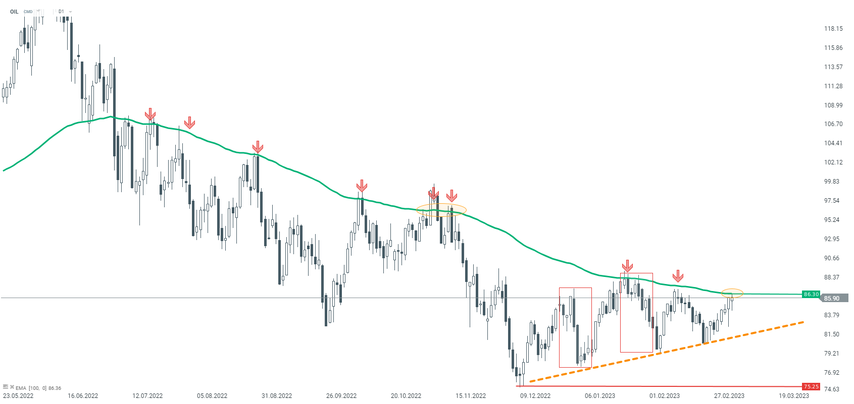 Notowania ropy naftowej (OIL) po raz kolejny testują kluczową średnią EMA100, która od dłuższego czasu utrzymywała trend spadkowy na tym surowcu. Poziom 86.30$ powinien być traktowany jako istotny opór w średnim terminie. W przypadku odbicia się w tym miejscu, trend może zostać wznowiony. W przeciwnym razie, wybicie w górę, może zwiastować zmianę sentymentu na wzrostowy. Źródło: xStation5