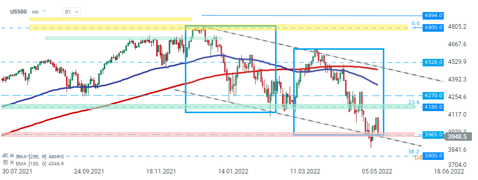US500 mocno cofnął się w trakcie dzisiejszej sesji i ponownie testuje kluczowe wsparcie na poziomie 3965 pkt, które wyznacza dolna granica struktury 1:1 oraz dolne ograniczenie kanału spadkowego. Jeśli obecny sentyment się utrzyma, kolejny cel dla sprzedających znajduje się w okolicy 3800 pkt, co zbiega się z 38,2% zniesieniem Fibonacciego fali wzrostowej zapoczątkowanej w marcu 2020 roku. Z drugiej strony, jeśli kupujący odzyskają kontrolę, może nastąpić kolejny impuls wzrostowy w kierunku oporu na poziomie 4180 pkt. Źródło:xStation5