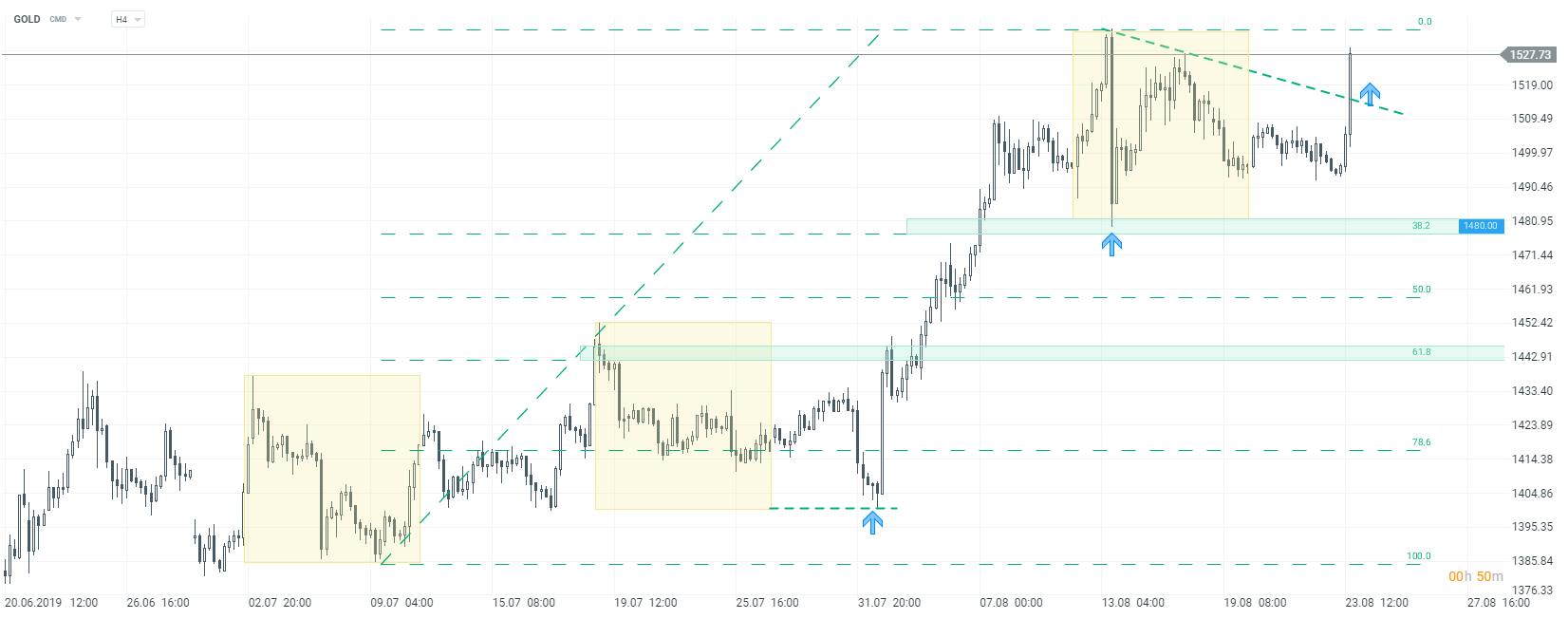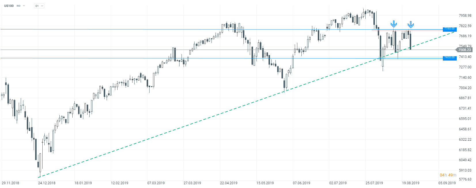 Dzisiejsza sesja była pełna emocji. Inwestorzy przede wszystkim wyczekiwali wystąpienia Jerome Powella w Jackson Hole. Jednak jak się okazało to nie prezes Fed odegrał dziś “pierwsze skrzypce”. Ponowna eskalacja konfliktu na linii USA - Chiny doprowadziła do dużej zmienności na rynku. Zaczęło się od niespodziewanej informacji z Pekinu. Chiny zdecydowały się w odwecie nałożyć cła na towary o wartości 75 miliardów dolarów. Pierwsze taryfy mają wejść w życie z początkiem września, a kolejne w grudniu. Taki ruch jest oczywiście tłumaczony wcześniejszą decyzją Donalda Trumpa o nałożeniu dodatkowych ceł na towary chińskie. Jak widać, pomimo ostatnich zapewnień o tym, że największe mocarstwa będą kontynuować negocjacje, konflikt ponownie przybiera na sile. Reakcja rynku nie powinna dziwić. Zaraz po wypłynięciu informacji dotyczących kolejnych ceł rynek akcji zanurkował. Następnie mogliśmy obserwować odbicie, które wiązało się z pewnymi nadziejami co do wypowiedzi Jerome Powella. Prezes Fed jednak niczym nie zaskoczył rynków, jego wypowiedź była bardzo neutralna, niemniej indeksy giełdowe zaczęły odrabiać wcześniejsze straty.