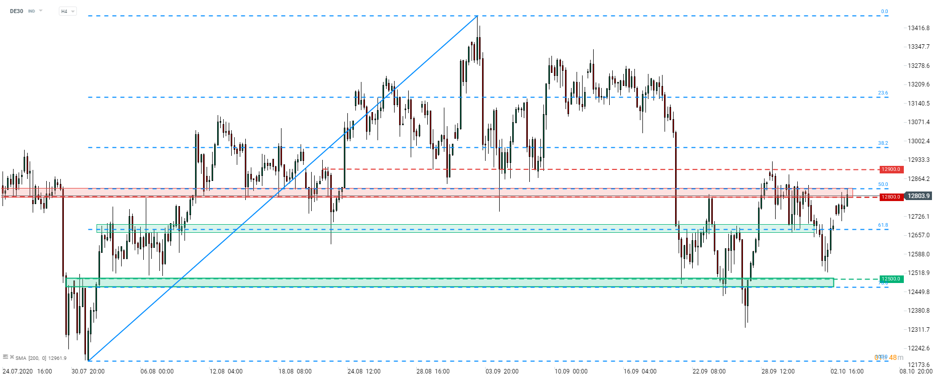 DE30 testuje strefę oporu przy 12 800 pkt wobec poprawy nastrojów na światowych rynków. Źródło: xStation5