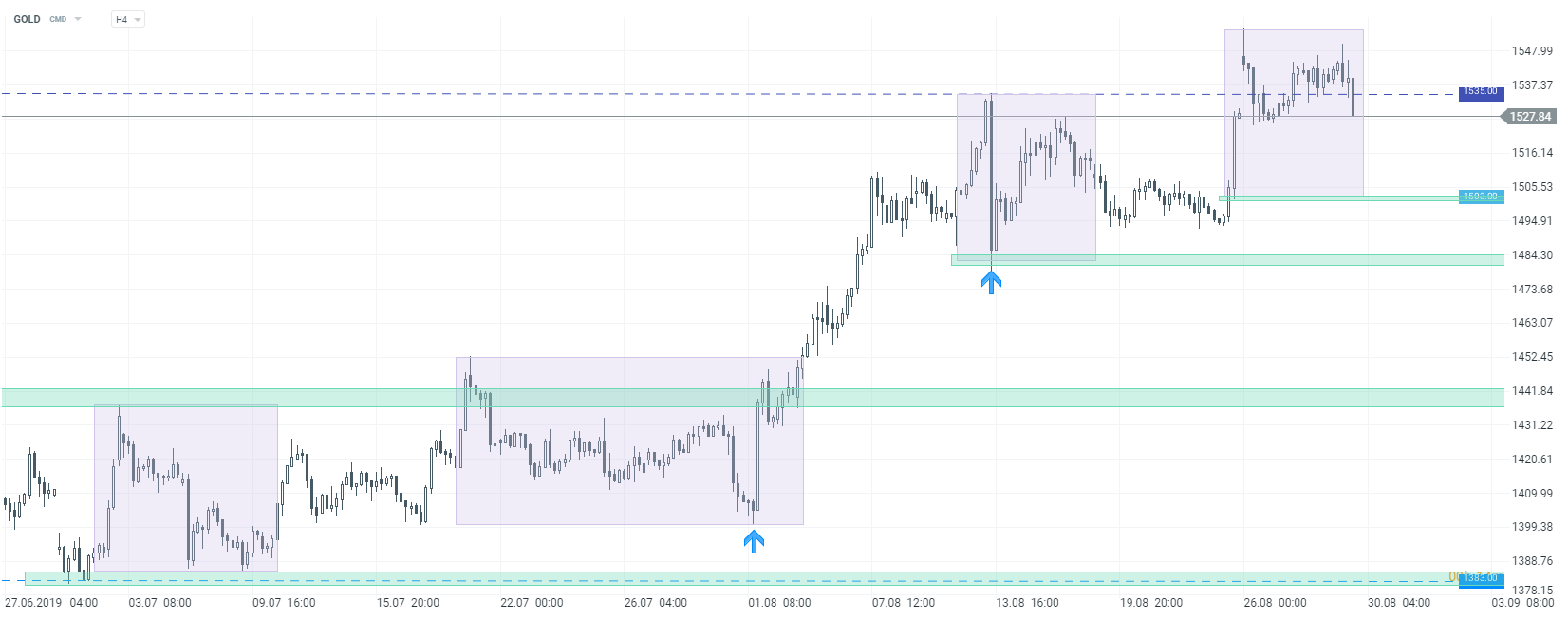 Złoto z szansą na test dolnego ograniczenia układu Overbalance. Źródło: xStation