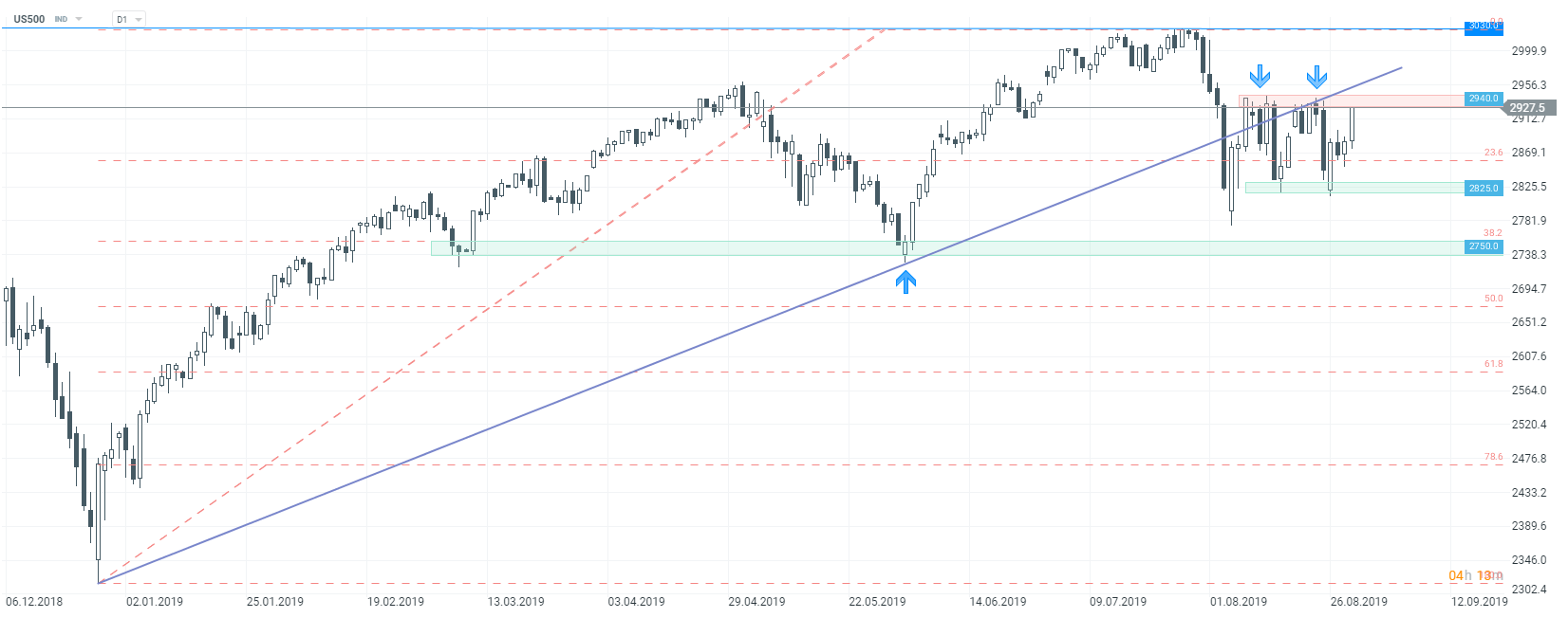 US500 próbuje wracac do wzrostów, kurs dociera do kluczowego oporu. Źródło: xStation