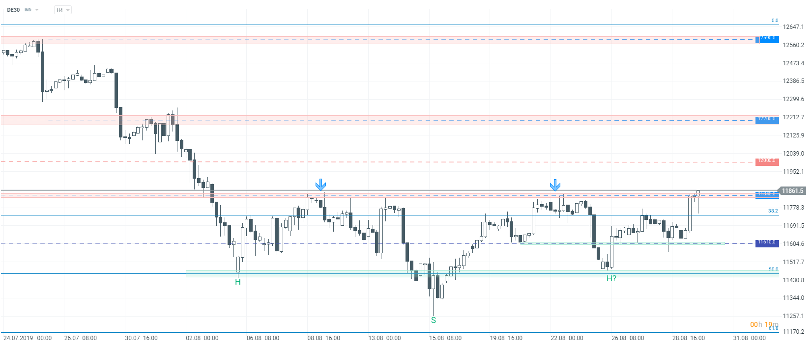 Przed godziną 17:00 mogliśmy obserwować nagłe cofnięcie na niemieckim indeksie giełdowym, który odbił się od strefy oporowej przy poziomie 11840 pkt (podowem były wypowiedzi jednego z członków EBC, który powiedział, że wznowienie programu QE nie jest konieczne). Ruch w dół był jednak chwilowy i kurs zdołał ostatecznie wyjść powyżej istotnej strefy podażowej. Dlatego też podczas jutrzejszej sesji możliwe są dalsze wzrosty, na interwale H4 istnieje bowiem szansa na realizację szerokiej struktury oRGR (odwróconej głowy z ramionami). Tak długo jak kurs będzie się utrzymywał powyżej strefy, istnieje szansa na atak okrągłego poziomu 12000 pkt, a nawet strefy przy 12 200 pkt.