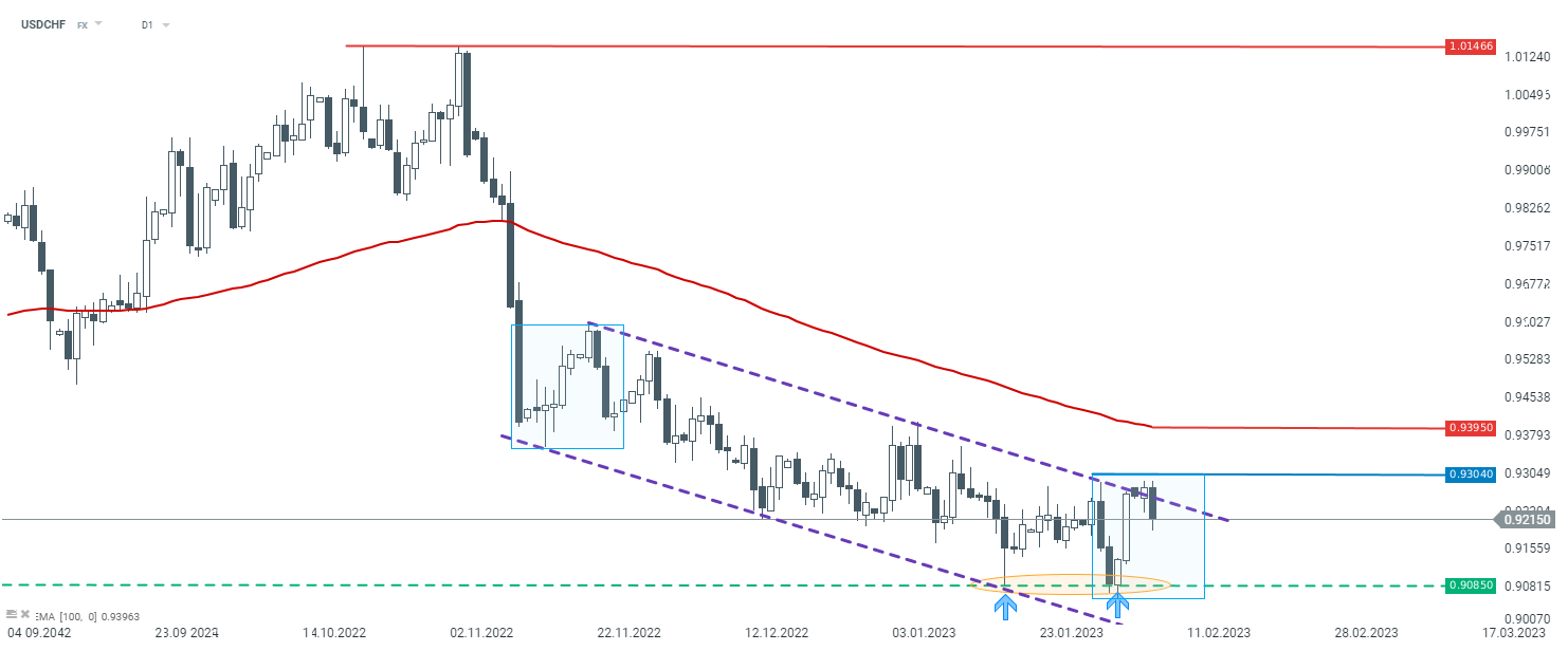 Notowania USDCAD od pewnego czasu poruszają się w kanale spadkowym. Pomimo dynamicznego odbicia od wsparcia przy 0,9085, kurs nie zdołał opuścić wspomnianego kanału. Zgodnie z klasycznymi założeniami analizy technicznej główny trend pozostaje więc spadkowy. Gdyby jednak ruch w górę został wznowiony, oprócz kanału warto zwrócić uwage na układ 1:1 przy 0,9304 i średnią EMA100 przy 0,9395. Źródło: xStation5