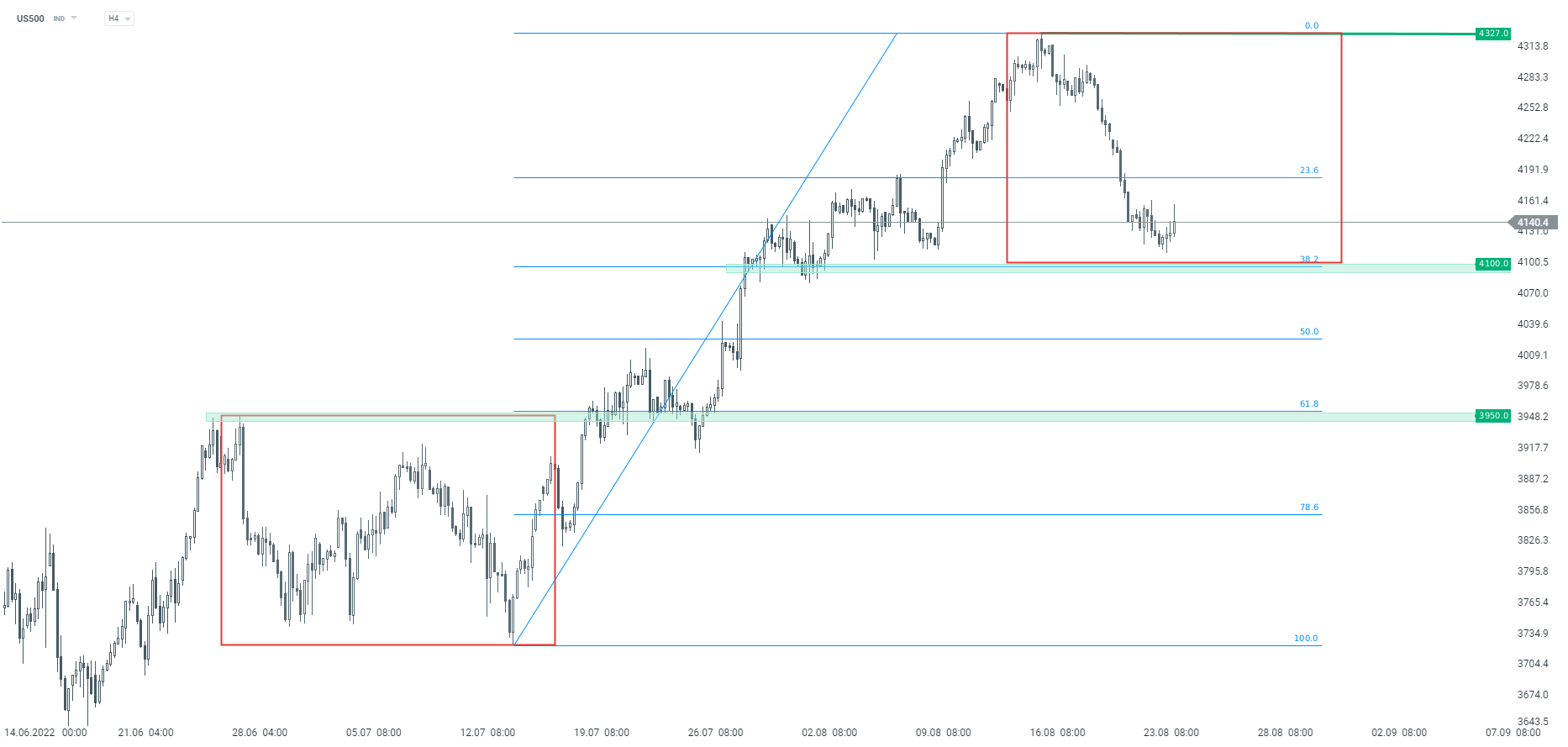 US500 próbuje wyhamowywać spadki, niemniej na ostatniej świecy H4 buduje się spory cień górny, co może prowadzić do pogłębienia przeceny w kierunku wsparcia przy 4100 pkt. Poziom ten pozostaje kluczowy w krótkim terminie, a jego zanegowanie może doprowadzić do przyspieszenia ruchu w dół. Źródło: xStation5