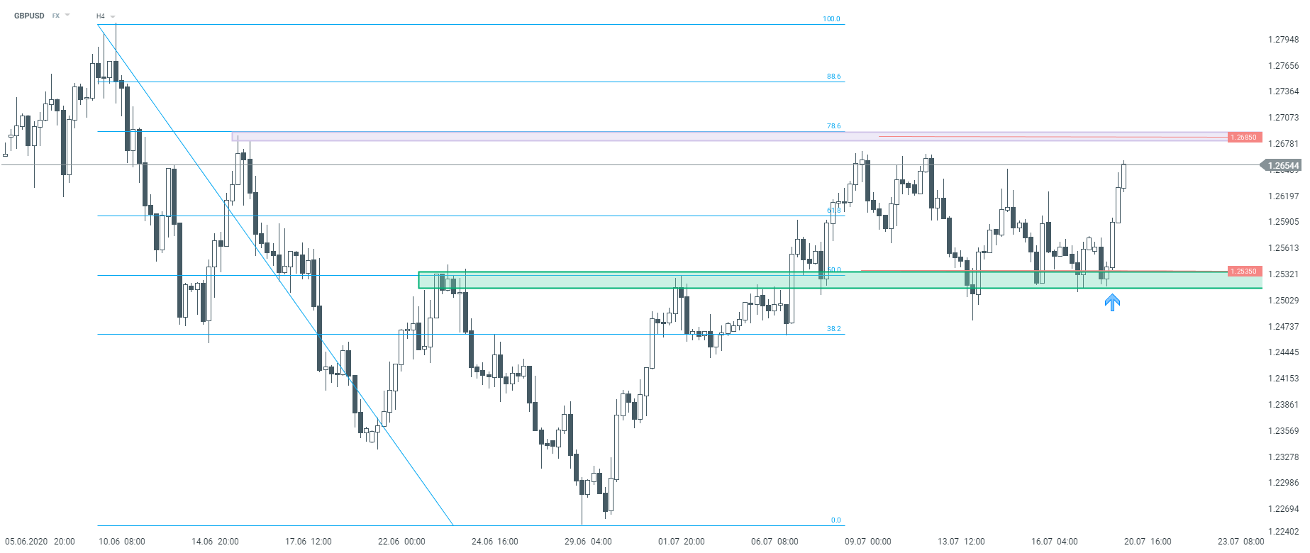 Funt brytyjski umacnia się dziś do dolara amerykańskiego. Para walutowa GBPUSD odbiła się ponownie od wsparcia przy 1,2535, a atak na 1,2685 jest możliwy w najbliższym czasie. Jeżeli poziom ten zostanie pokonany, droga do wzrostów w kierunku czerwcowych szczytów zostanie otwarta. Źródło: xStation