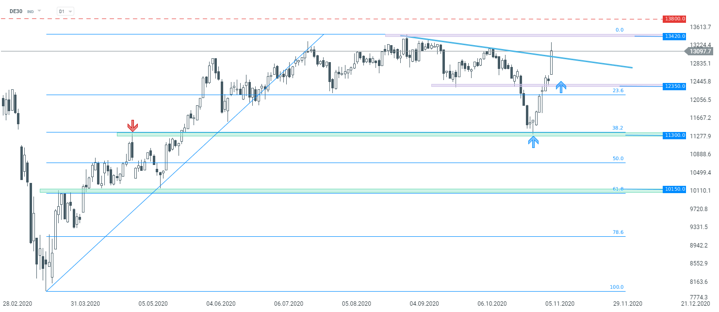 Niemiecki indeks giełdowy DAX wystrzelił w górę po doniesieniach dotyczących szczepionki. Patrząc na interwał D1, doszło do wybicia linii poprowadzonej po ostatnich wierzchołkach, co może otwierać drogę w kierunku strefy oporowej przy 13420 pkt. Źródło: xStation5