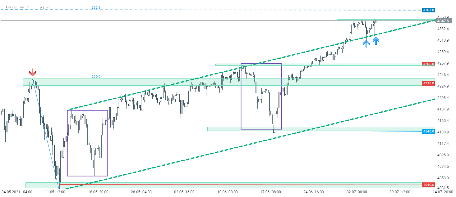 Podczas dzisiejszej sesji notowania US500 ponownie odbiły się od górnego ograniczenia pokonanego wcześniej kanału wzrostowego, co potwierdza iż indeks ten pozostaje w trendzie wzrostowym. Jeżeli obecny sentyment się utrzyma, istnieje szans na atak poziomu 4367 pkt, który wynika z położenia mierzenia zewnętrznego 161,8% Fibonacciego.