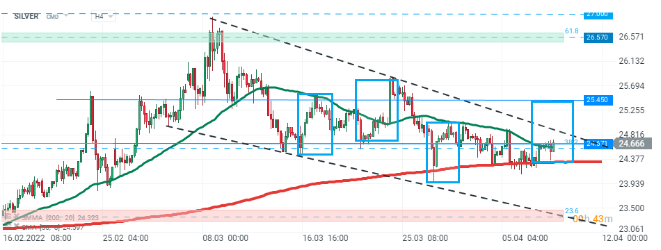 Cena srebra (SILVER) zdołała utrzymać się powyżej lokalnego wsparcia na poziomie 24,67 USD, które zbiega się z 38,2% zniesieniem Fibonacciego fali spadkowej zapoczątkowanej w sierpniu 2020 roku. Niemniej jednak kupujący muszą przebić się powyżej górnego ograniczenia formacji klina, aby w pełni wznowić ruch w górę. Źródło: xStation 5