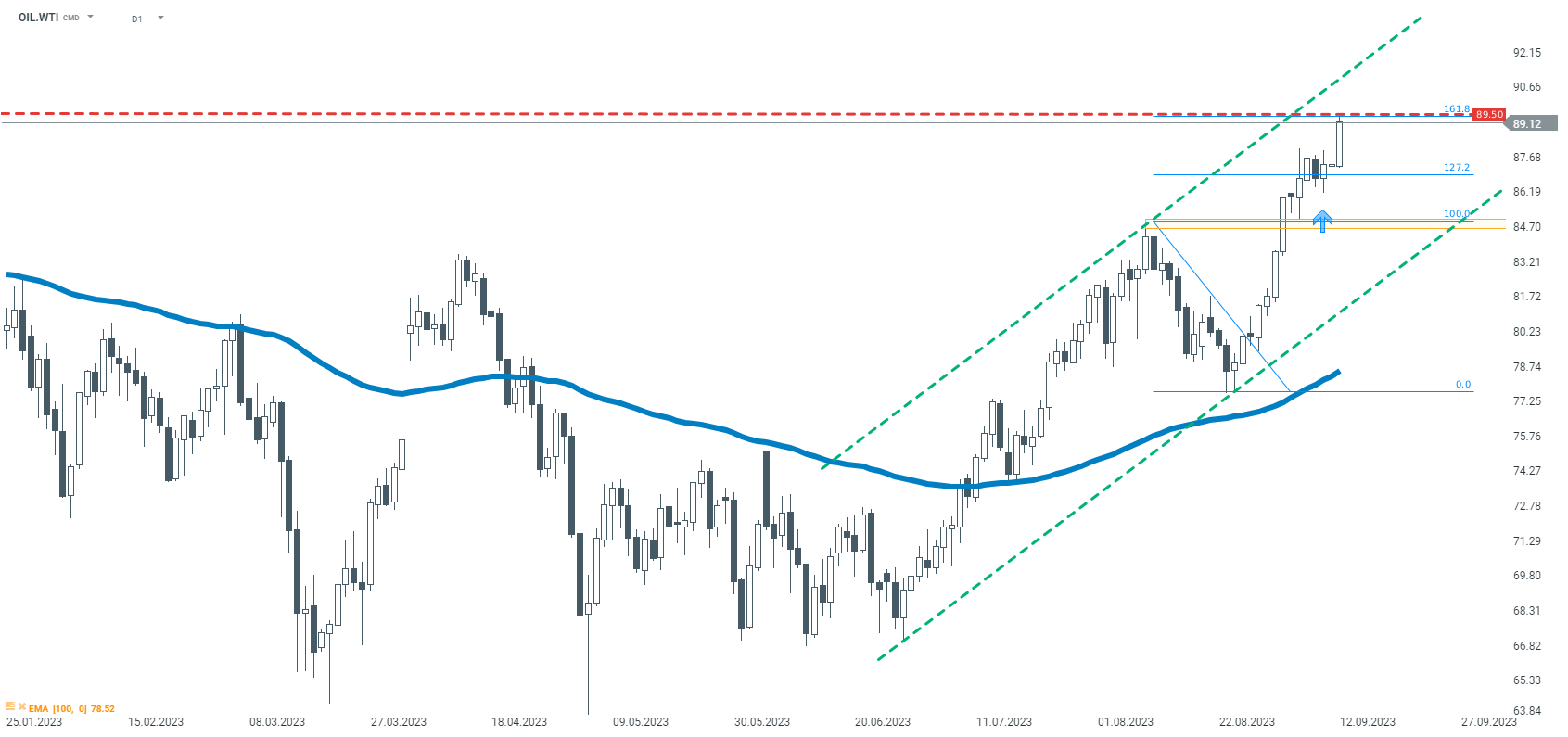Notowania OIL.WTI znalazły się na najwyższych poziomach od listopada 2022 roku. Patrząc na interwał D1 obserwujemy test oporu wynikającego z mierzenia 161,8% Fibonacciego, wyznaczonego na ostatniej korekcie spadkowej. Źródło: xStation5