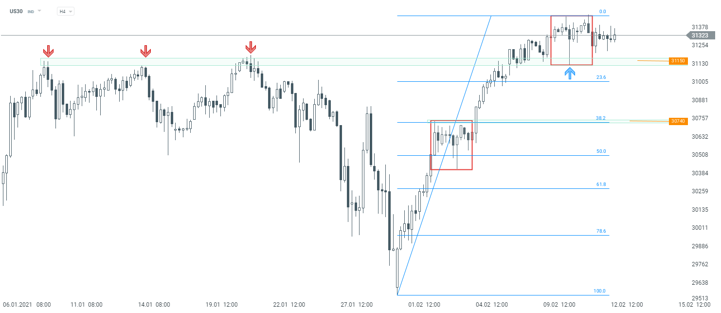 US30 wybił się na początku tygodnia powyżej strefy oporu przy 31150 pkt, która następnie zadziałała jako wsparcie. Zgodnie z klasycznymi założeniami AT, dopóki kurs znajduje się powyżej, należy oczekiwać kontynuacji wzrostów. Źródło: xStation5