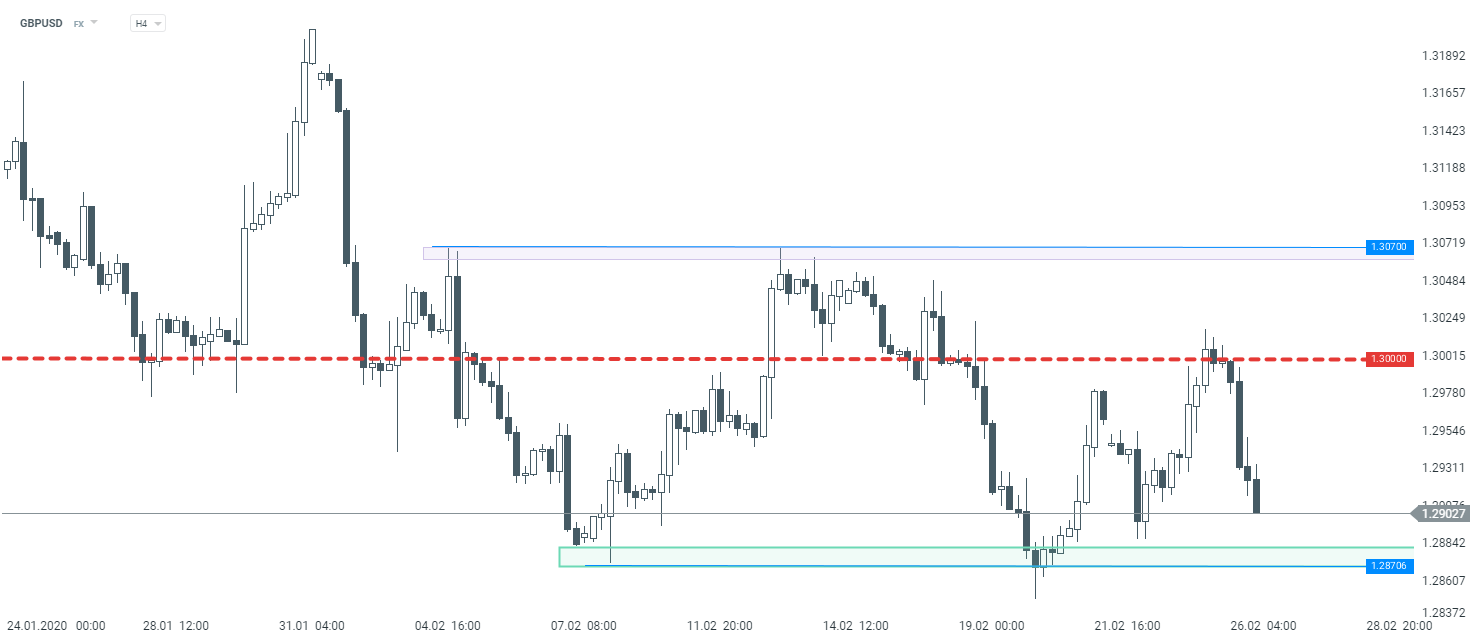 Kurs funta brytyjskiego do dolara amerykańskiego (GBPUSD) nie zdołał wybić się powyżej psychologicznej bariery przy 1,30 USD, po czym na rynku pojawili się sprzedający. Aktualnie kluczowe wsparcie powinna stanowić strefa przy 1,2870. Źródło: xStation5