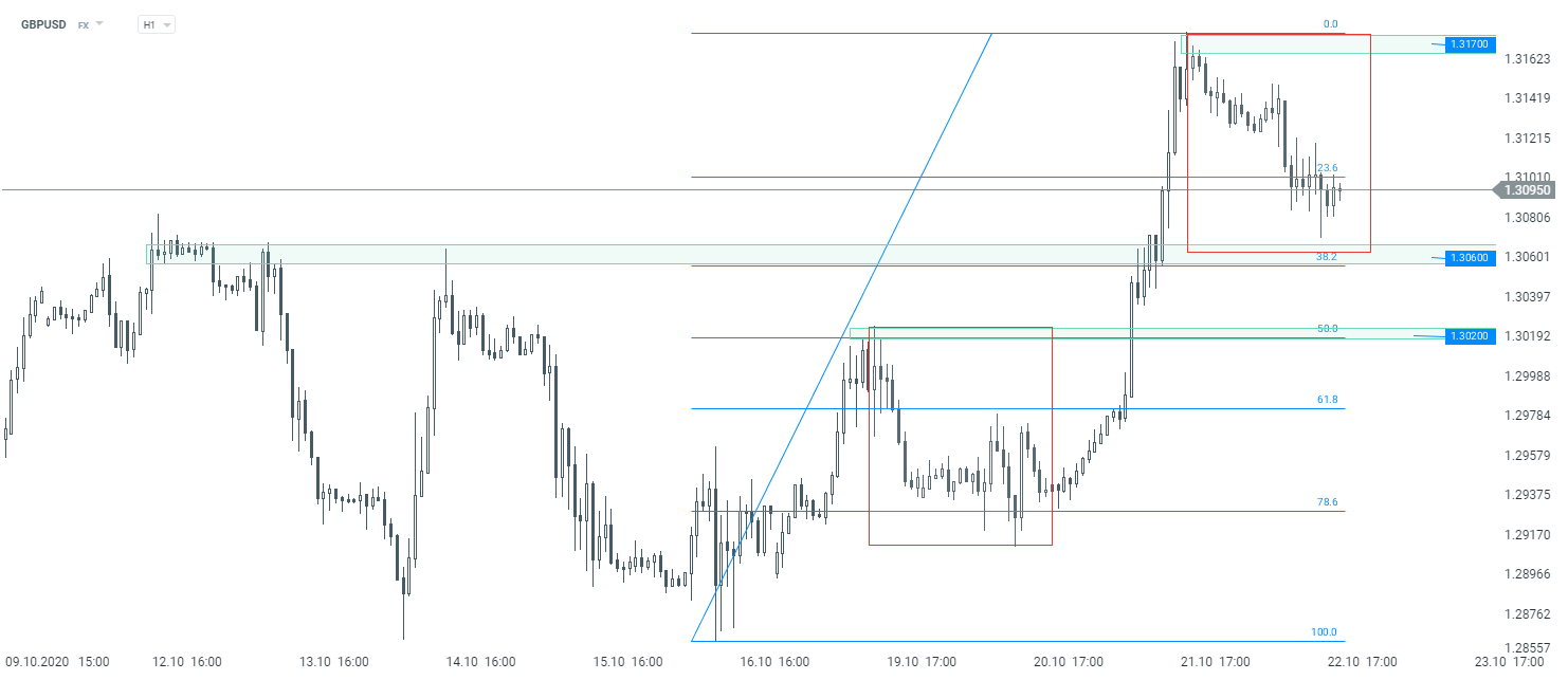 Podczas dzisiejszej sesji obserwujemy cofnięcie na GBPUSD. Patrząc na interwał H1 notowania niemal zahaczyły o wsparcie przy 1,3060, które pozostaje kluczowe w krótkim terminie. Poziom ten wynika nie tylko z wcześniejszych reakcji cenowych, ale także z układu 1:1 oraz mierzenia 38,2% ostatniej fali wzrostowej. Odbicie się w tym miejscu może doprowadzić do wygenerowania kolejnej fali wzrostowej. Źródło: xStation