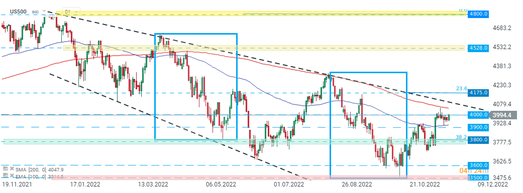 US500 po raz kolejny zbliża się do psychologicznego oporu na poziomie 4000 pkt, ponieważ wydaje się, że inwestorzy zignorowali nowe ograniczenia w Chinach i skupiają się na jutrzejszych minutkach FOMC. Źródło: xStation 5