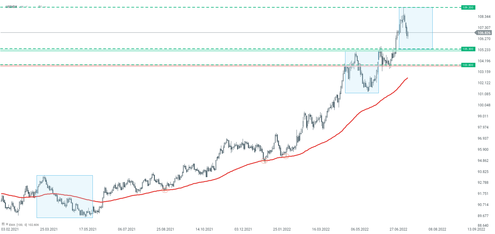 Notowania indeksu dolara (USDIDX) znajdują się w długoterminowym trendzie wzrostowym. Pomimo, że ostatnie dni przyniosły korektę spadkową, trend nie wydaje się zagrożony. Niemniej w przypadku rozszerzenia obecnego ruchu korekcyjnego, jako kluczowe wsparcie należy traktować strefę przy poziomie 105.30, która to wynika z wcześniejszych lokalnych szczytów, jak i dolnego ograniczenia układu 1:1. Źródło: xStation5