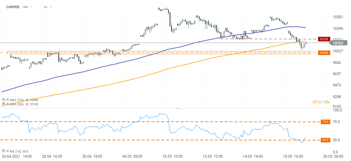 Ceny miedzi (COPPER) próbują odbijać po tym, jak wskaźnik RSI spadł poniżej 30 pkt, wskazując na poziomy wyprzedania. Miedź wciąż znajduje się jednak poniżej 200-godzinnej średniej kroczącej (pomarańczowa linia). Pierwszym oporem mogą okazać się okolice 10 220 USD, wyznaczające niedawne lokalne dołki. Źródło: xStation5