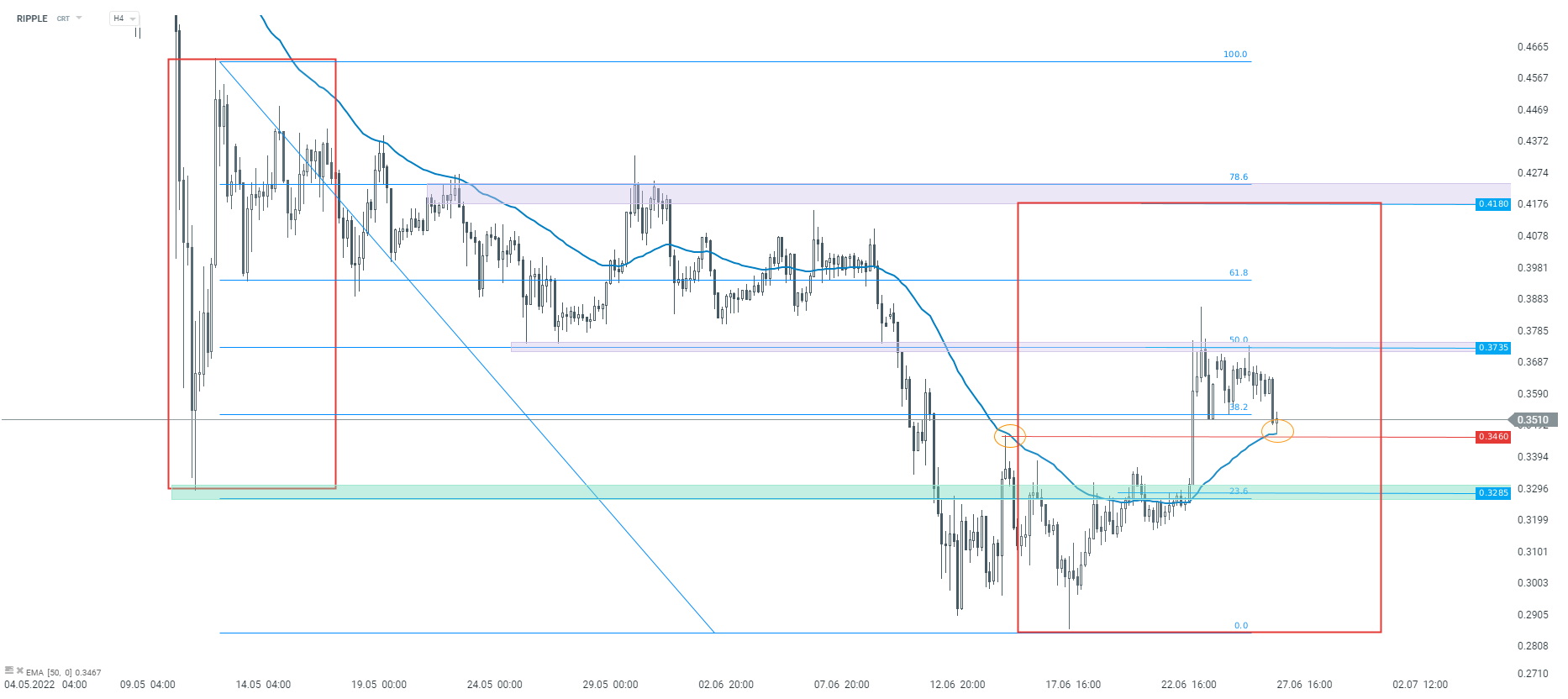 Notowania Ripple nie zdołały utrzymać zeszłotygodniowego impetu wzrostowego i odbiły się od oporu przy 0,3735. Niemniej patrząc na interwał H4, dzisiejsze spadki zostały wyhamowane na poziomie 0,3460, który to stanowi istotne wsparcie w krótkim terminie. Poziom ten wynika ze średniej EMA50 i wcześniejszych szczytów z 16 czerwca. Źródło: xStation5
