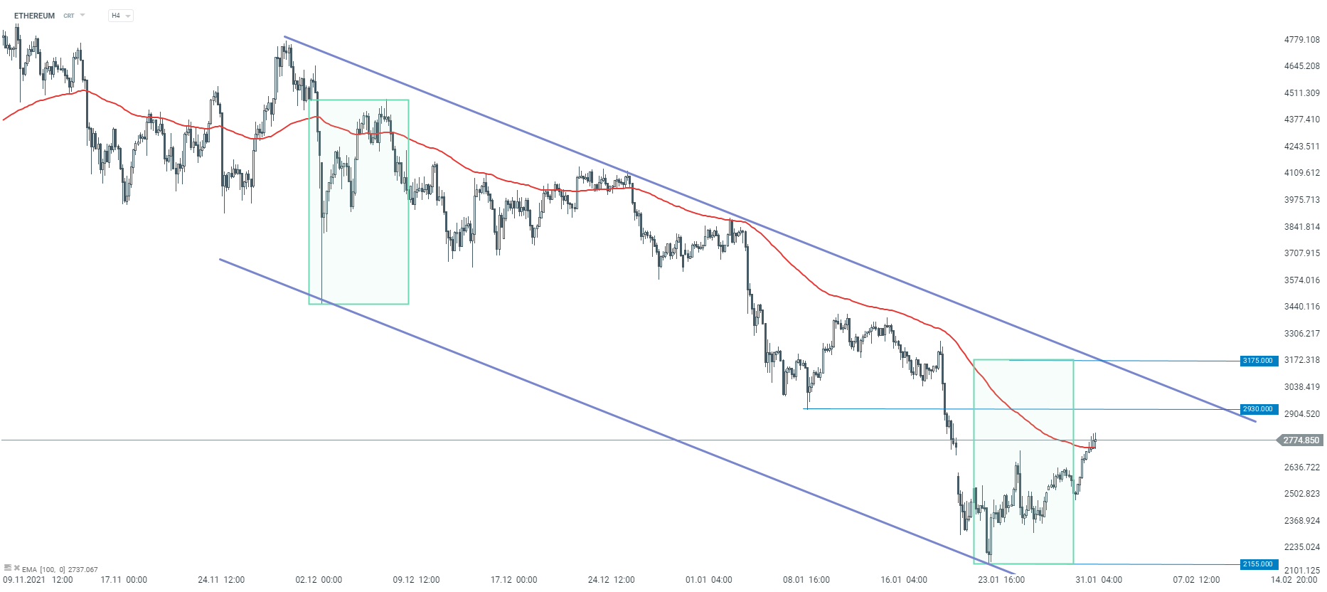 Notowania Ethereum kontynuują ruch w ramach korekty wzrostowej. Główny trend pozostaje jednak spadkowy, dlatego też w przypadku rozszerzenia korekty, powinniśmy zwrócić uwagę na dwa opory. Pierwszy z nich wypada przy 2930$ i wynika z poprzednich dołków, a drugi znajduje się w rejonach 3175$ i wynika z górnego ograniczenia układu 1:1 oraz górnego ograniczenia kanału spadkowego. Źródło: xStation5
