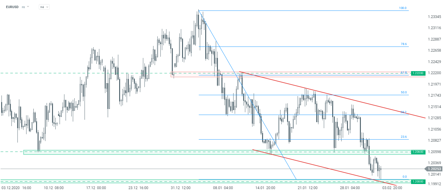 Spadki na EURUSD wyhamowały tuż przed okrągłym poziomem 1,20, o którym wspominaliśmy w poprzednich analizach. Poziom ten pozostaje kluczowym wsparciem w krótkim terminie. Niemniej, aby myśleć o większym odreagowaniu ostatniej przeceny, notowania musiałby wrócić powyżej strefy przy 1,2060 USD. Źródło: xStation5