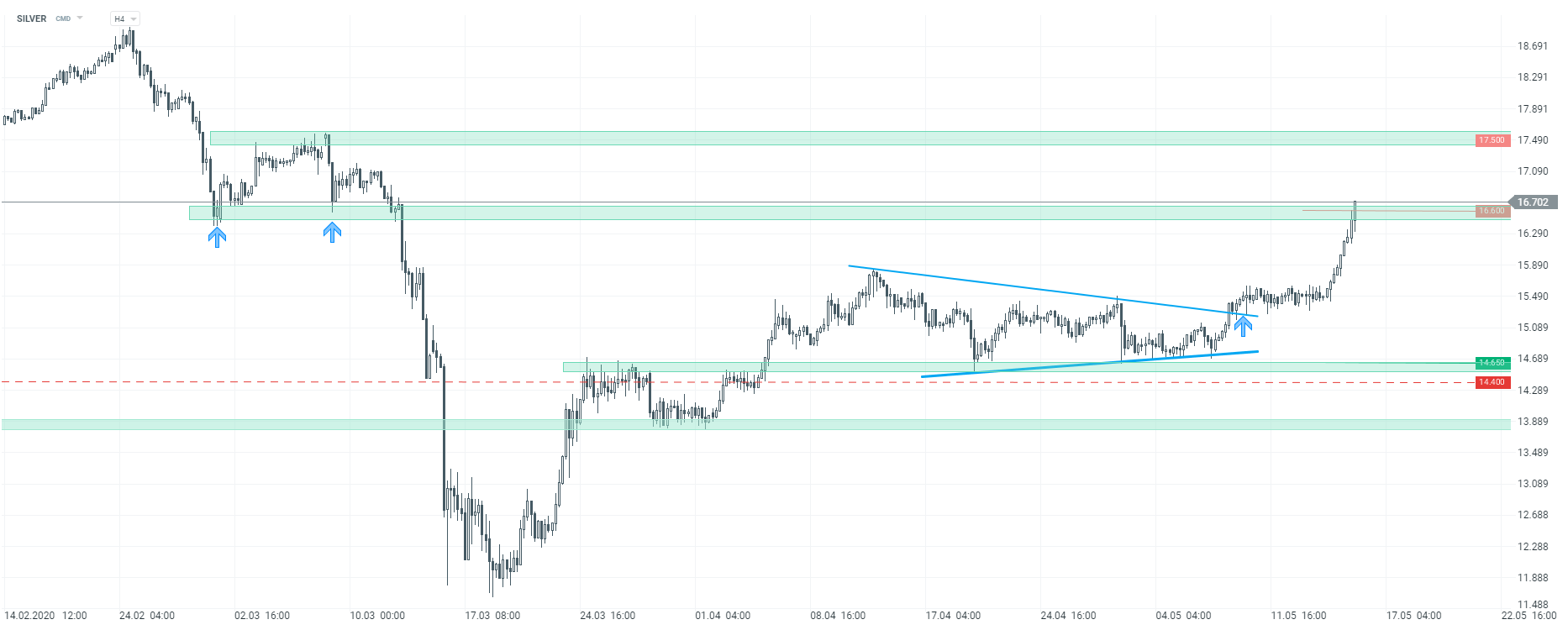 Srebro kontynuuje zwyżkę po wybiciu górą z formacji trójkąta, tym samym doszło do realizacji scenariusza z ostatniego zagrania dnia. Aktualnie notowania wychodzą powyżej poziomu 16,6$, co może otworzyć drogę w kierunku oporu przy 17,5$. Źródło: xStation5