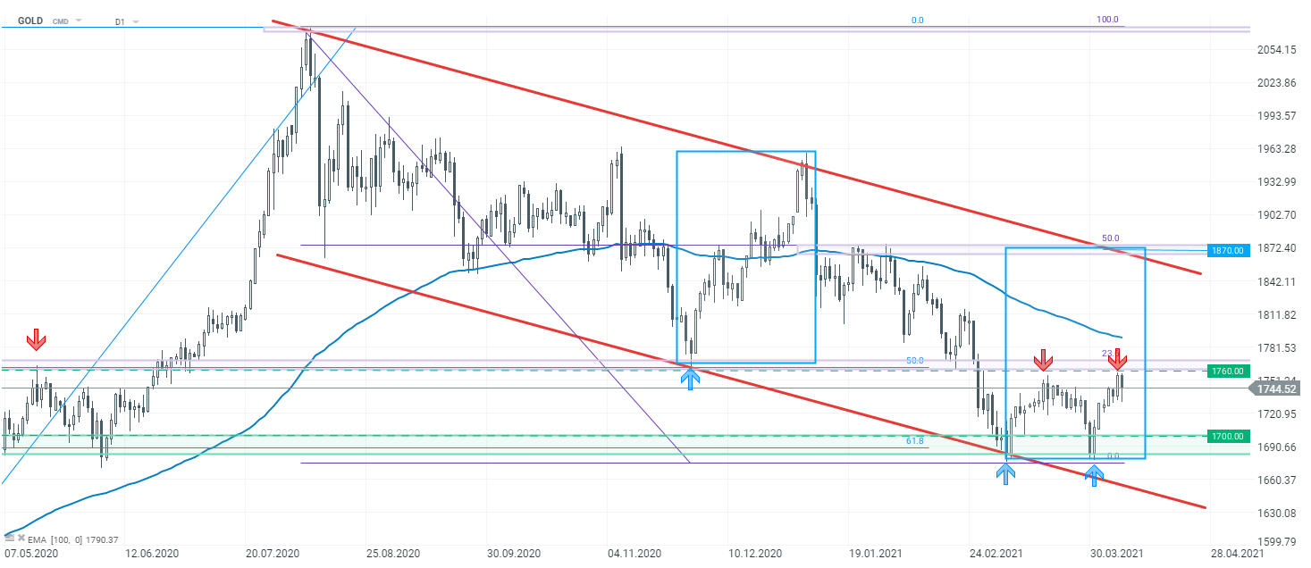 Jeśli chodzi o sytuację techniczną, na wykresie D1 widać budującą się formację podwójnego dna. Pierwsza próba przełamania strefy oporowej (1750-1760$), wynikającej między innymi z linii szyi układu, wcześniejszych reakcji cenowych oraz mierzenia 23,6% Fibo - okazał się nieudana. Niemniej jeżeli w przyszłym tygodniu doszłoby do sforsowania tej przeszkody, niewykluczone jest rozszerzenie korekty wzrostowej.